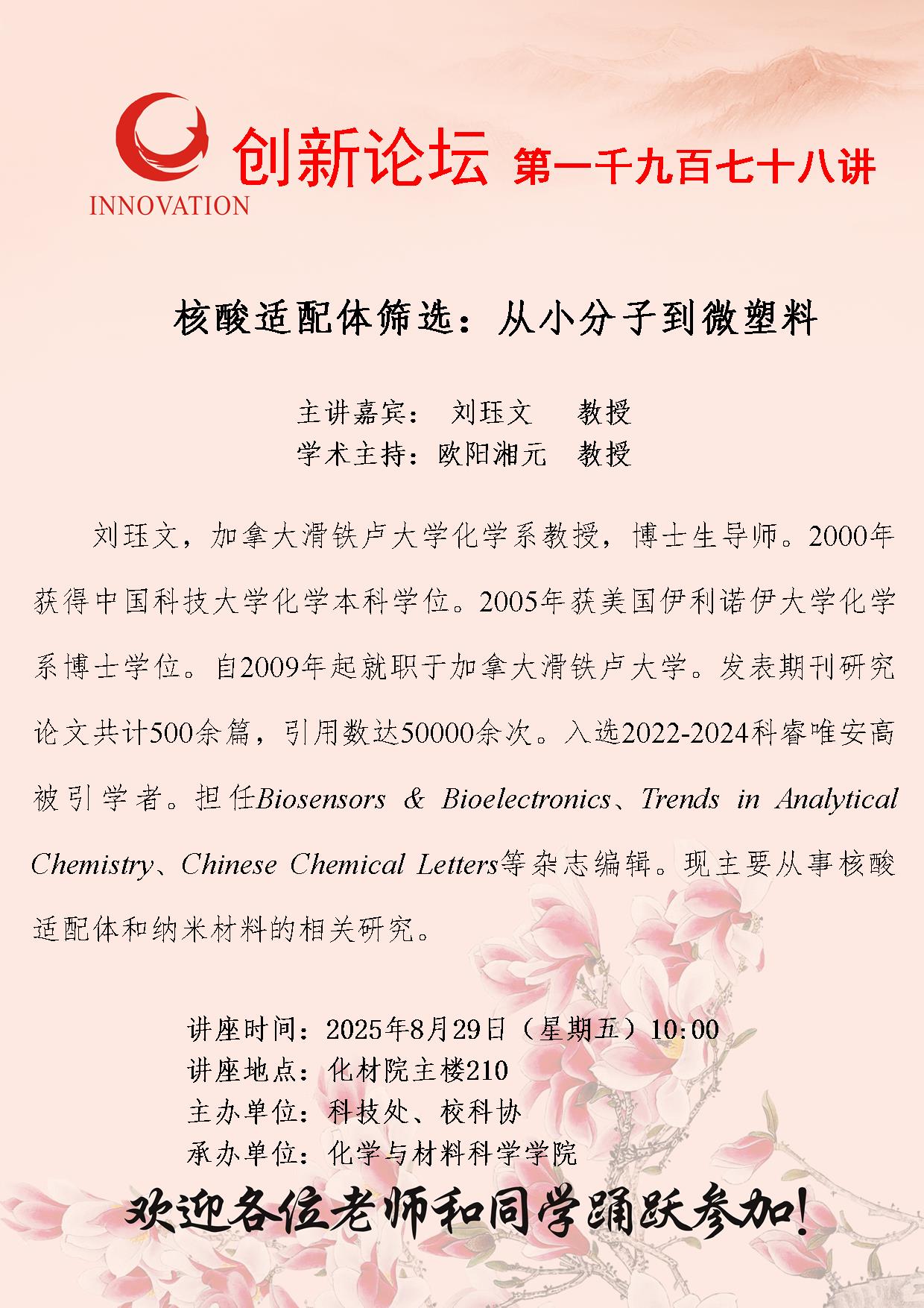 刘珏文 教授 开云网页版登录入口创新论坛第一千九百七十八讲:核酸适配体筛选:从小分子到微塑料 讲座时间 2025年8月29日(星期五)10:00 讲座地点 化材院主楼210 讲座人介绍 刘珏文 教授 讲座内容
