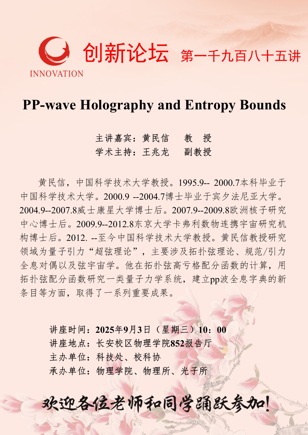 黄民信 教授 开云网页版登录入口创新论坛第一千九百八十五讲:PP-wave Holography and Entropy Bounds 讲座时间 2025年9月3日(星期三)10:00 讲座地点 长安校区物理学院852报告厅 讲座人介绍 黄民信 教授 讲座内容