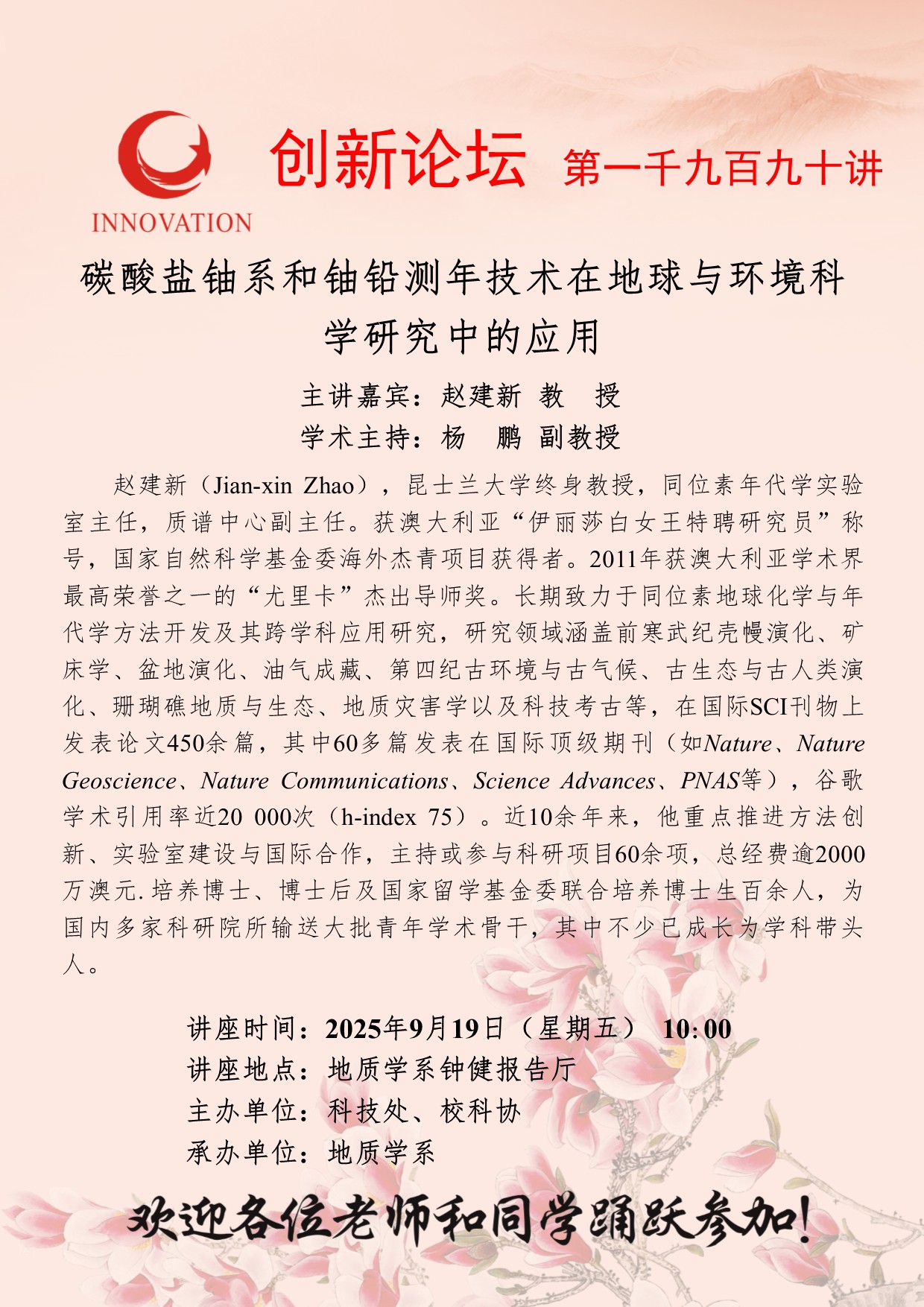 赵建新 教授 开云网页版登录入口创新论坛第一千九百九十讲:碳酸盐铀系和铀铅测年技术在地球与环境科学研究中的应用 讲座时间 2025年9月19日(星期五) 10:00 讲座地点 地质学系钟健报告厅 讲座人介绍 赵建新 教授 讲座内容