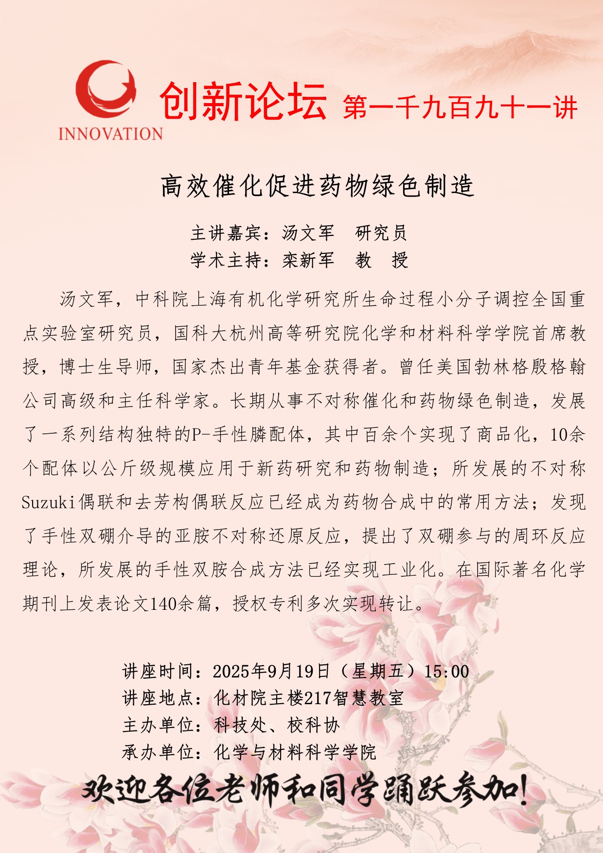 汤文军 研究员 开云网页版登录入口创新论坛第一千九百九十一讲:高效催化促进药物绿色制造 讲座时间 2025年9月19日(星期五)15:00 讲座地点 化材院主楼217智慧教室 讲座人介绍 汤文军 研究员 讲座内容