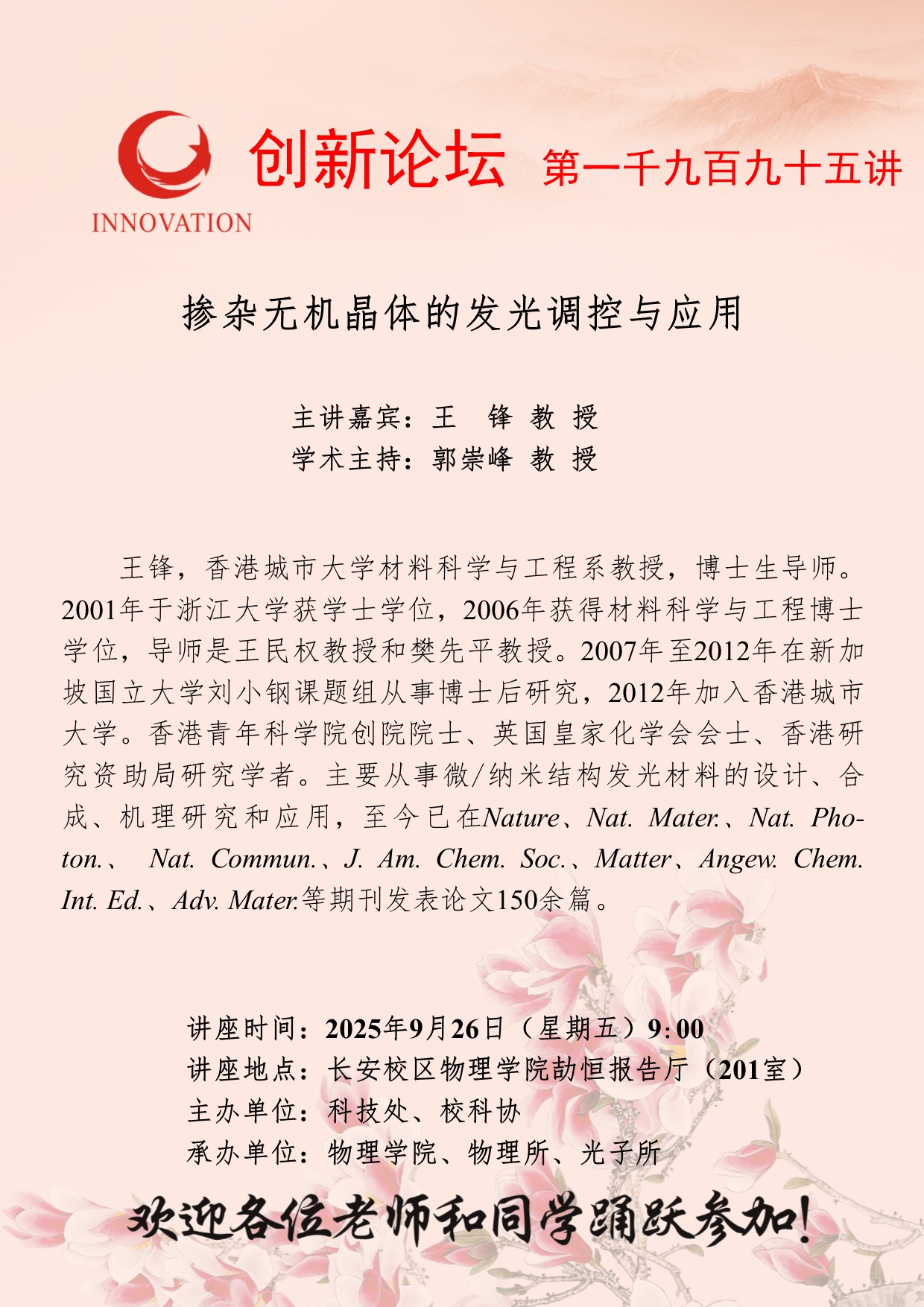 王锋 教授 开云网页版登录入口创新论坛第一千九百九十五讲:掺杂无机晶体的发光调控与应用 讲座时间 2025年9月26日(星期五)9:00 讲座地点 长安校区物理学院劼恒报告厅(201室) 讲座人介绍 王锋 教授 讲座内容
