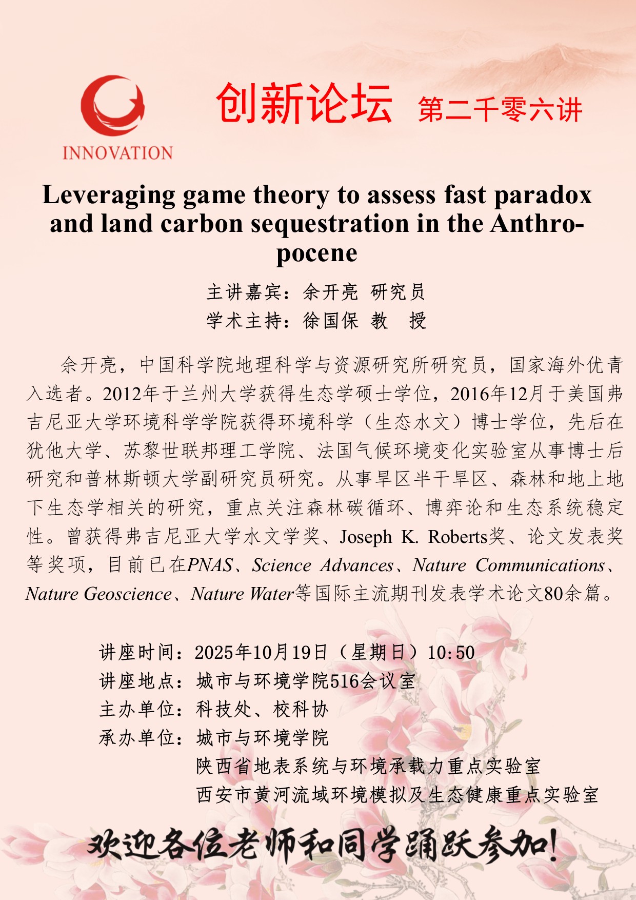 余开亮 研究员 开云网页版登录入口创新论坛第二千零六讲:Leveraging game theory to assess fast paradoxand land carbon sequestration in the Anthro-pocene 讲座时间 2025年10月19日(星期日)10:50 讲座地点 城市与环境学院516会议室 讲座人介绍 余开亮 研究员 讲座内容