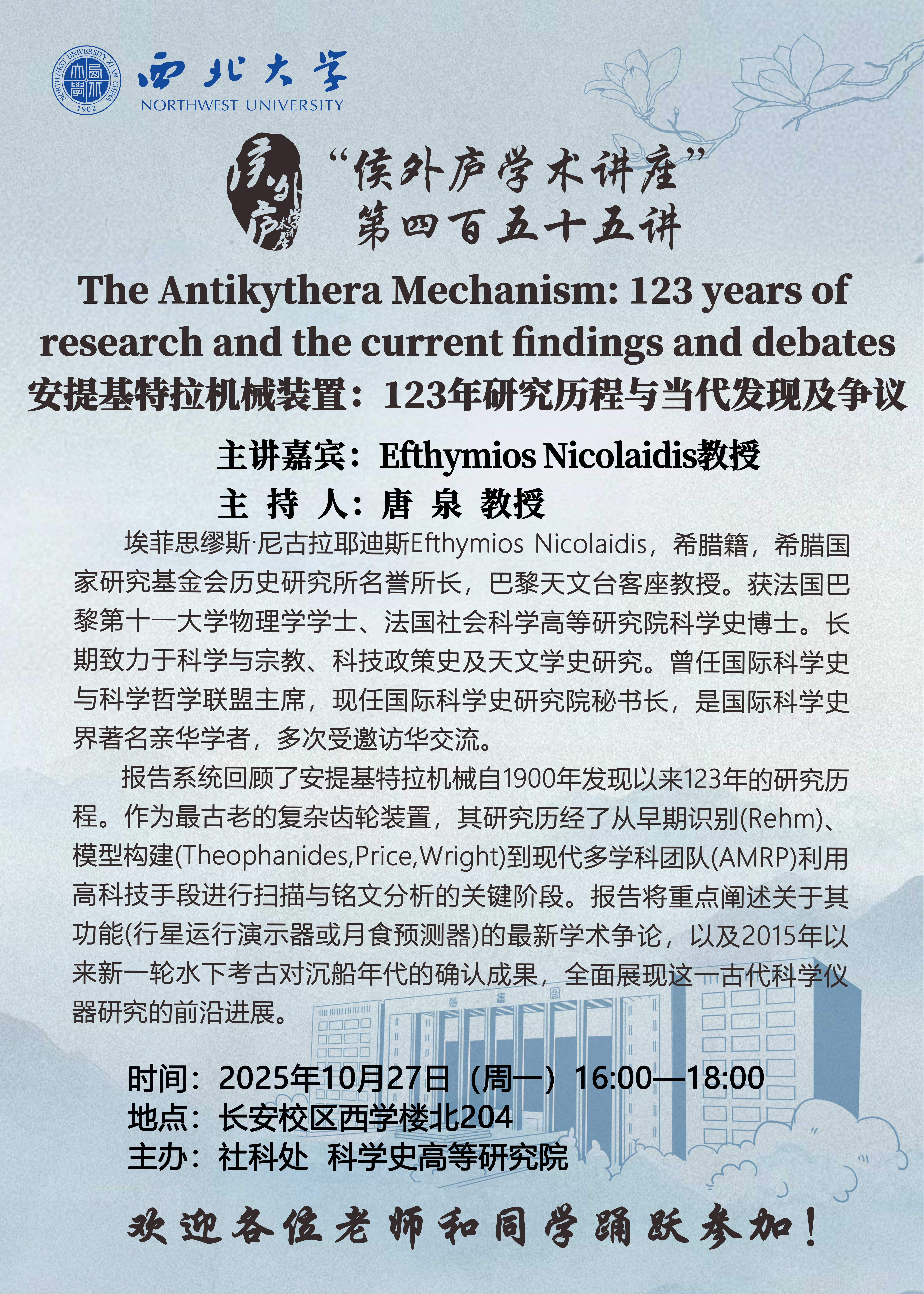 Efthymios Nicolaidis教授 “侯外庐学术讲座”第四百五十五讲:The Antikythera Mechanism: 123 years of research and the current findings and debates安提基特拉机械装置:123年研究历程与当代发现及争议 讲座时间 2025年10月27日(周一)16:00-18:00 讲座地点 长安校区西学楼北204 讲座人介绍 Efthymios Nicolaidis教授 讲座内容