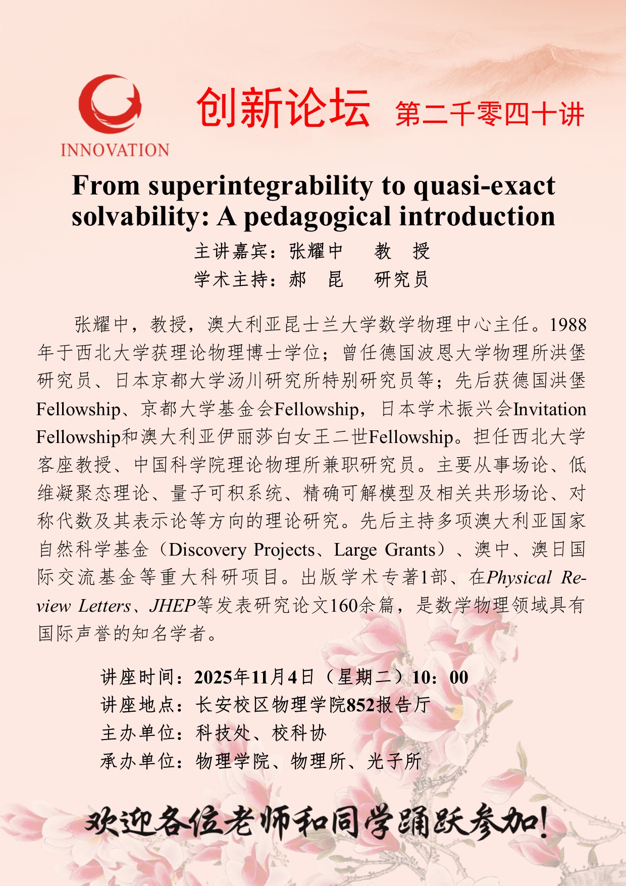 张耀中 教授 开云网页版登录入口创新论坛第二千零四十讲:From superintegrability to quasi-exact solvability: A pedagogical introduction 讲座时间 2025年11月4日(星期二)10:00 讲座地点 长安校区物理学院852报告厅 讲座人介绍 张耀中 教授 讲座内容