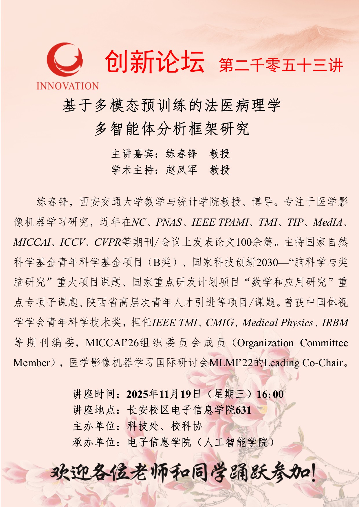 练春锋 教授 开云网页版登录入口创新论坛第二千零五十三讲:基于多模态预训练的法医病理学多智能体分析框架研究 讲座时间 2025年11月19日(星期三)16:00 讲座地点 长安校区电子信息学院631 讲座人介绍 练春锋 教授 讲座内容