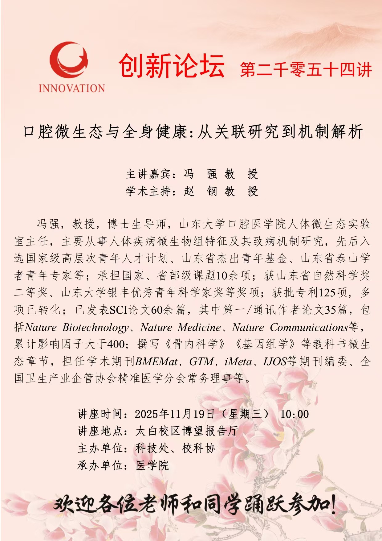 冯强 教授 开云网页版登录入口创新论坛第二千零五十四讲:口腔微生态与全身健康:从关联研究到机制解析 讲座时间 2025年11月19日(星期三) 10:00 讲座地点 太白校区博望报告厅 讲座人介绍 冯强 教授 讲座内容