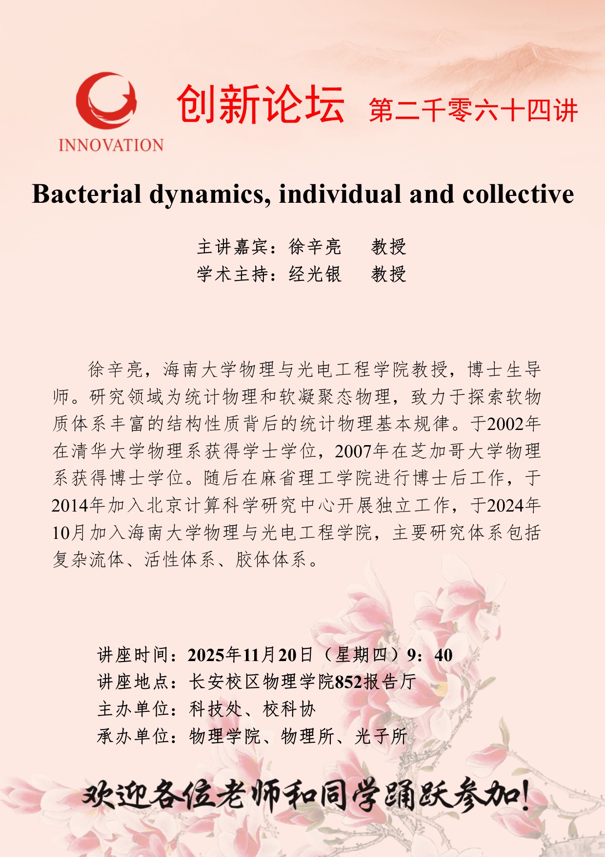 徐辛亮 教授 开云网页版登录入口创新论坛第二千零六十四讲:Bacterial dynamics, individual and collective 讲座时间 2025年11月20日(星期四)9:40 讲座地点 长安校区物理学院852报告厅 讲座人介绍 徐辛亮 教授 讲座内容