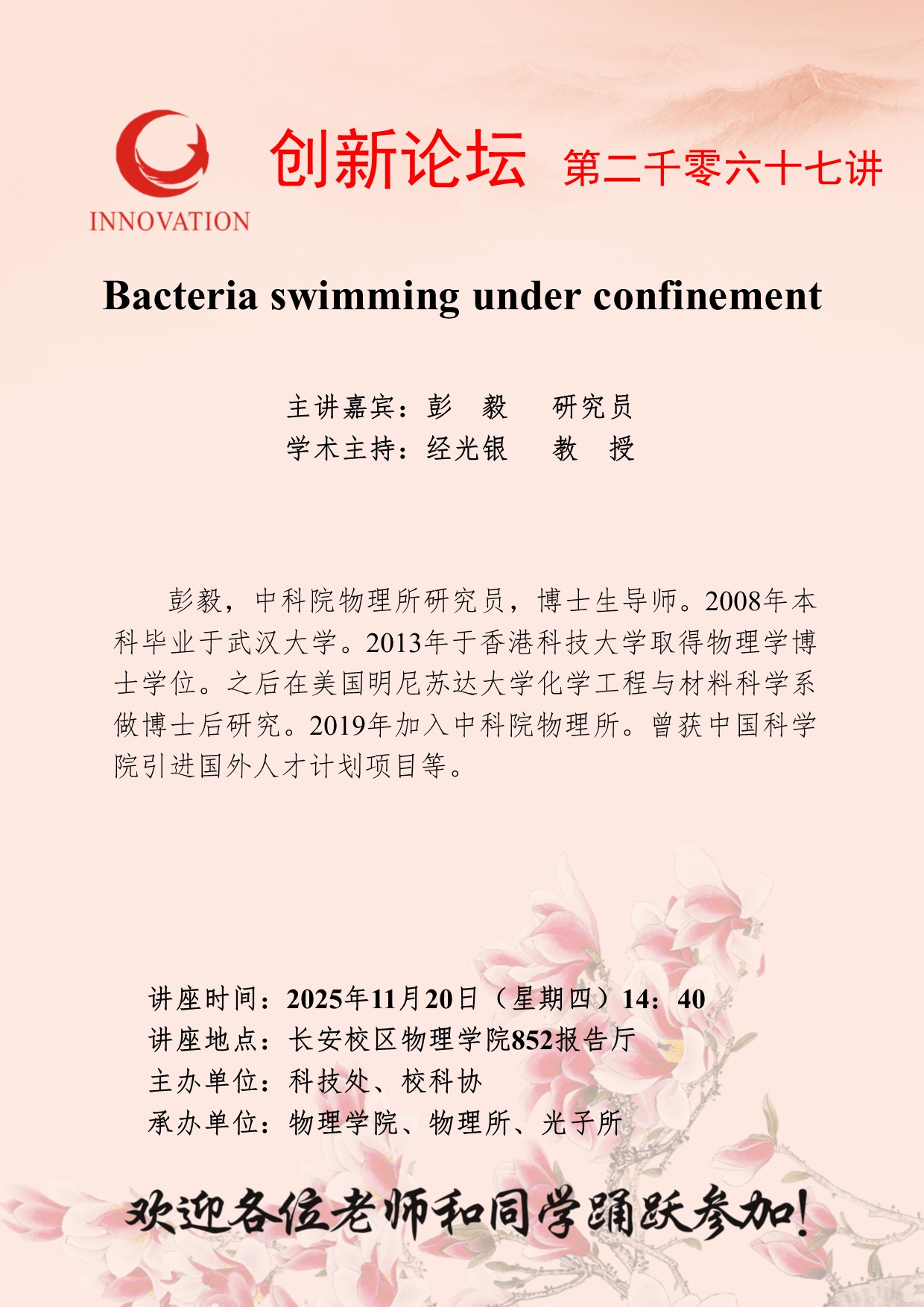 彭毅 研究员 开云网页版登录入口创新论坛第二千零六十七讲:Bacteria swimming under confinement 讲座时间 2025年11月20日(星期四)14:40 讲座地点 长安校区物理学院852报告厅 讲座人介绍 彭毅 研究员 讲座内容