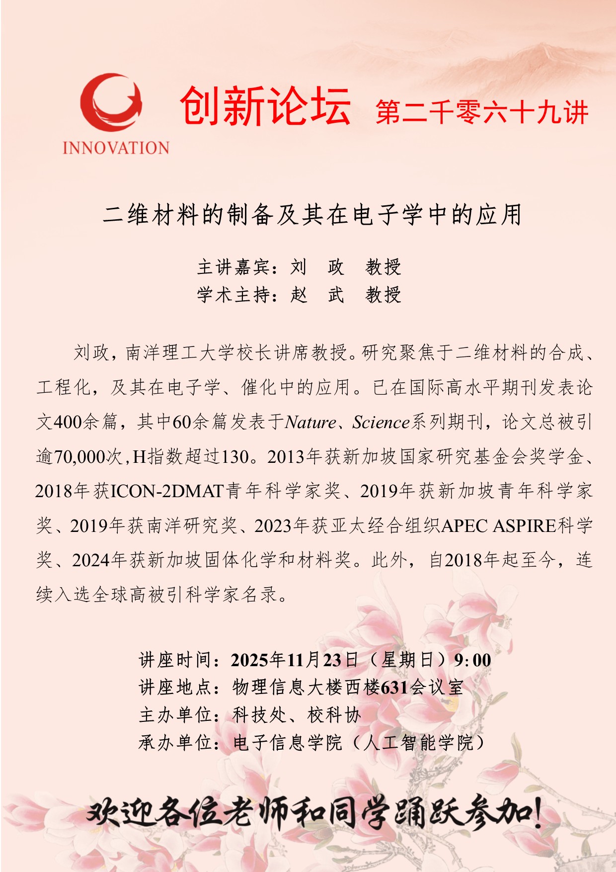 刘政 教授 开云网页版登录入口创新论坛第二千零六十九讲:二维材料的制备及其在电子学中的应用 讲座时间 2025年11月23日(星期日)9:00 讲座地点 物理信息大楼西楼631会议室 讲座人介绍 刘政 教授 讲座内容