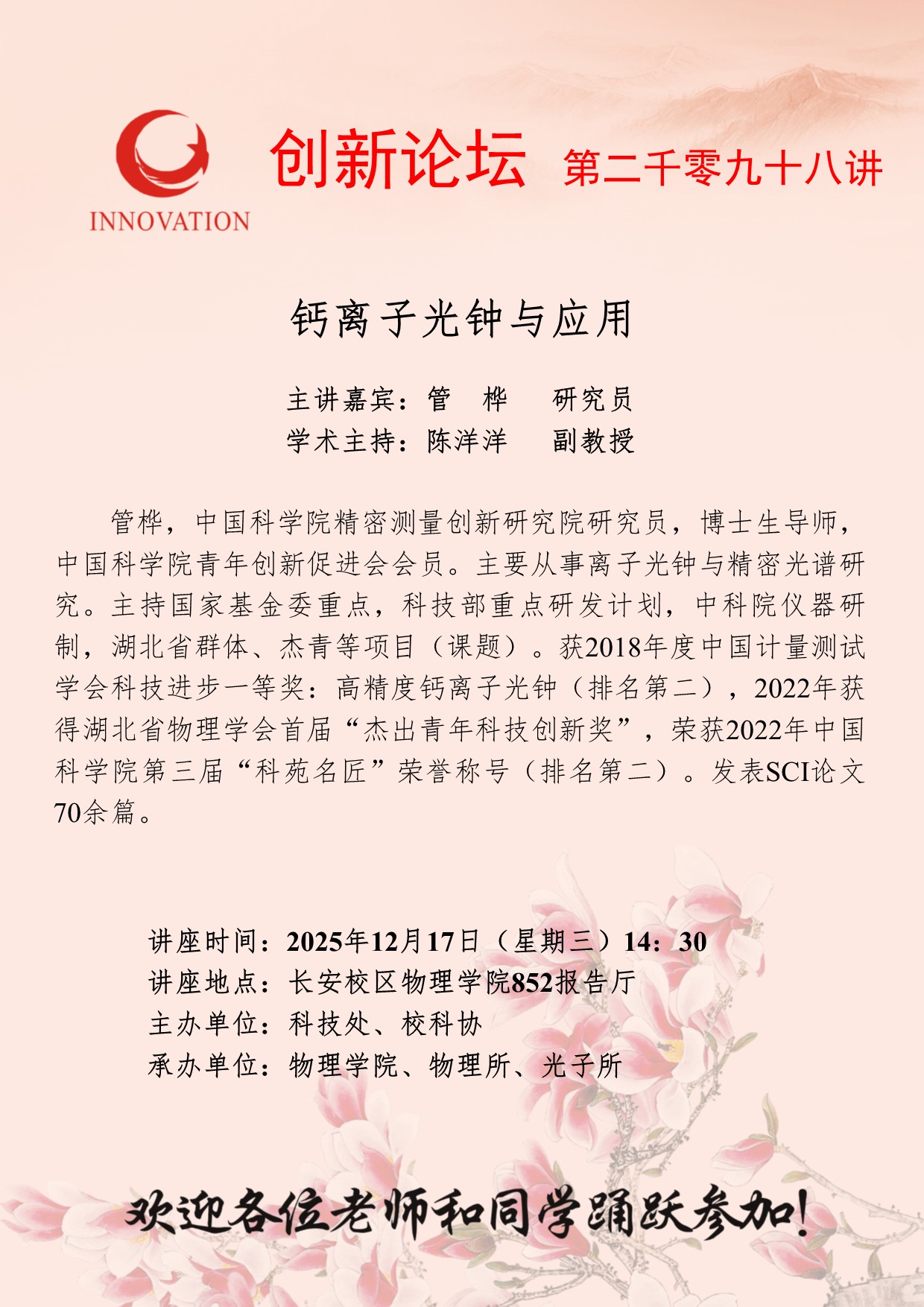 管桦 研究员 开云网页版登录入口创新论坛第二千零九十八讲:钙离子光钟与应用 讲座时间 2025年12月17日(星期三)14:30 讲座地点 长安校区物理学院852报告厅 讲座人介绍 管桦 研究员 讲座内容