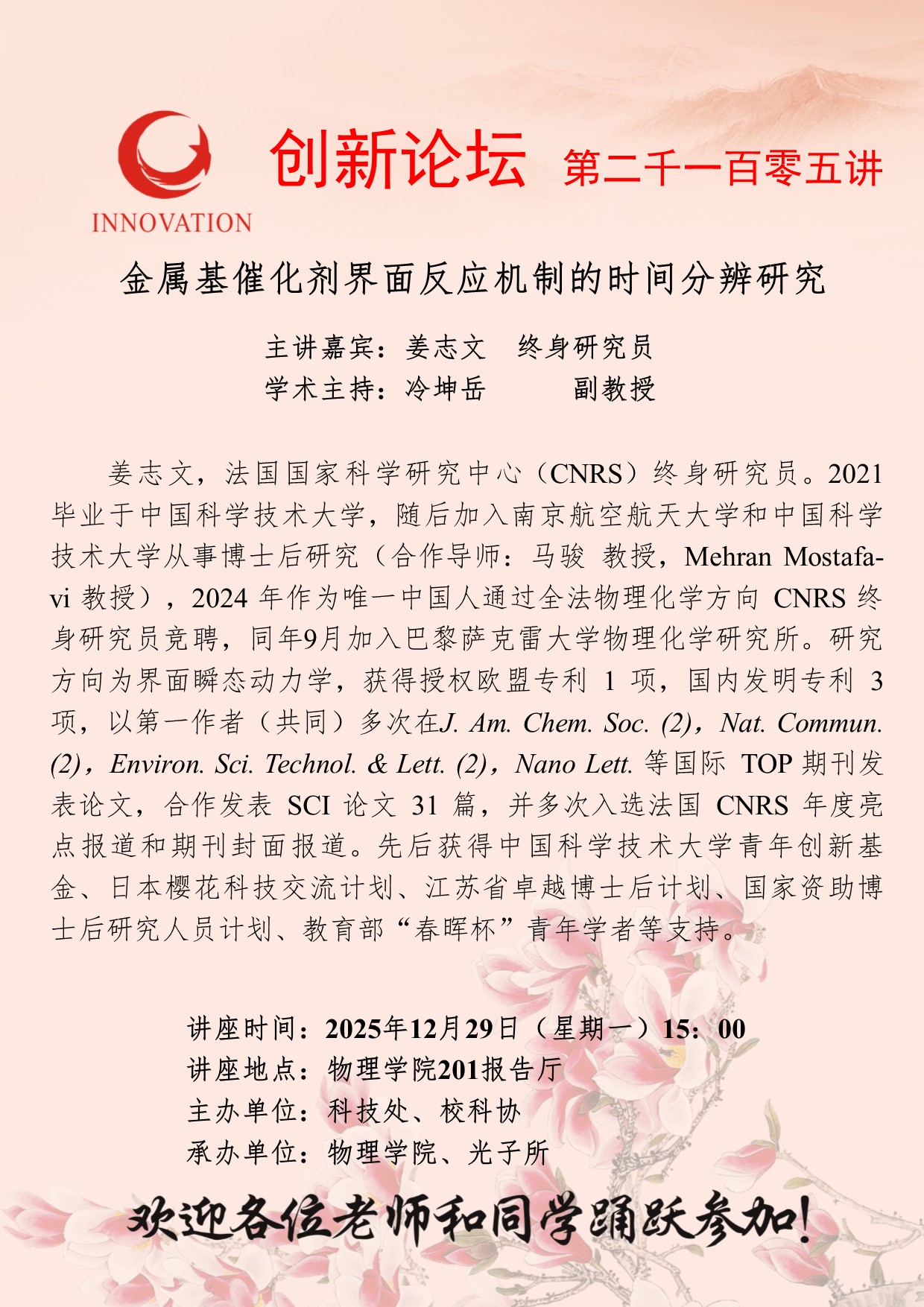 姜志文 终身研究员 开云网页版登录入口创新论坛第二千一百零五讲:金属基催化剂界面反应机制的时间分辨研究 讲座时间 2025年12月29日(星期一)15:00 讲座地点 物理学院201报告厅 讲座人介绍 姜志文 终身研究员 讲座内容