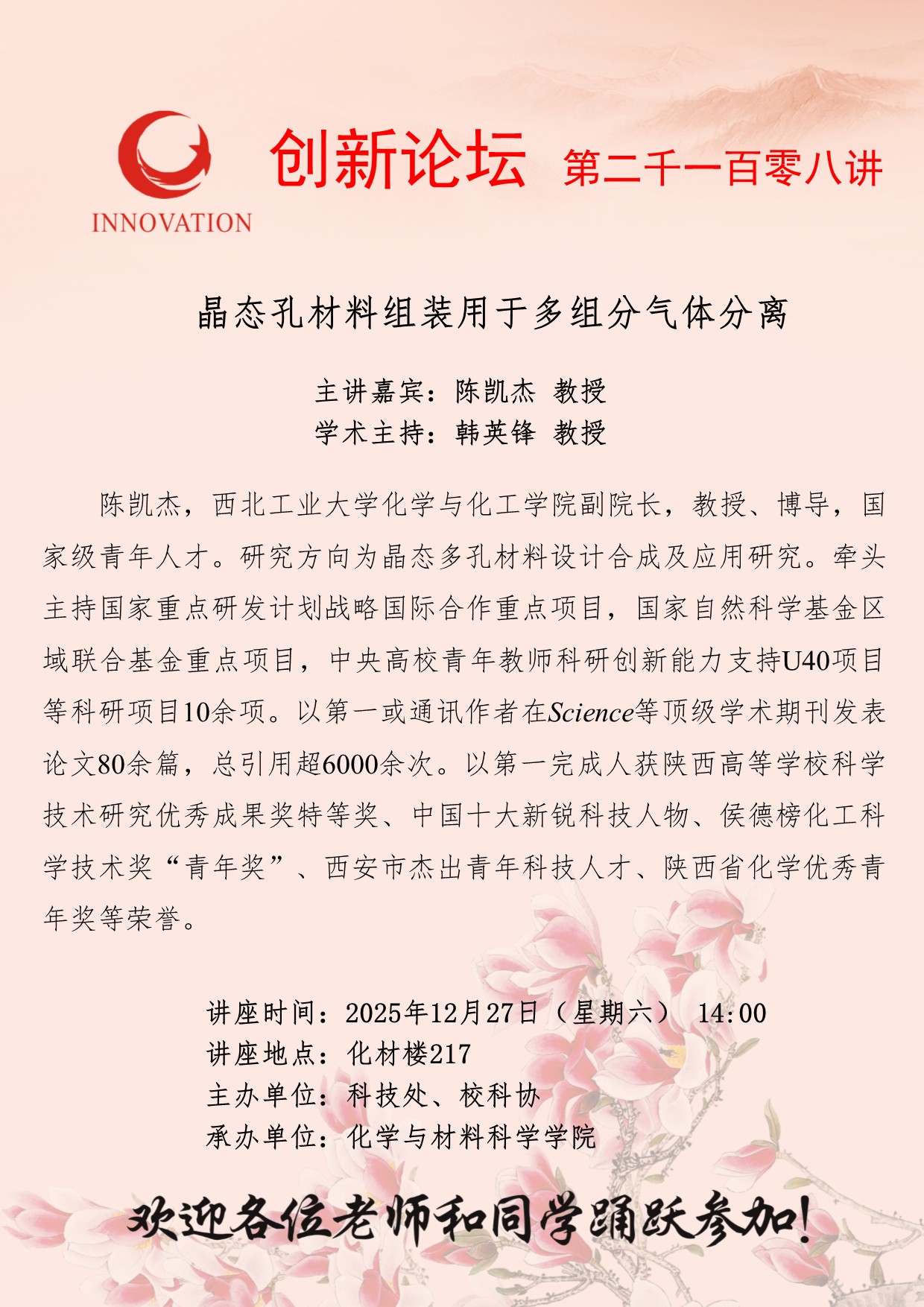 陈凯杰 教授 开云网页版登录入口创新论坛第二千一百零八讲:晶态孔材料组装用于多组分气体分离 讲座时间 2025年12月27日(星期六) 14:00 讲座地点 化材楼217 讲座人介绍 陈凯杰 教授 讲座内容