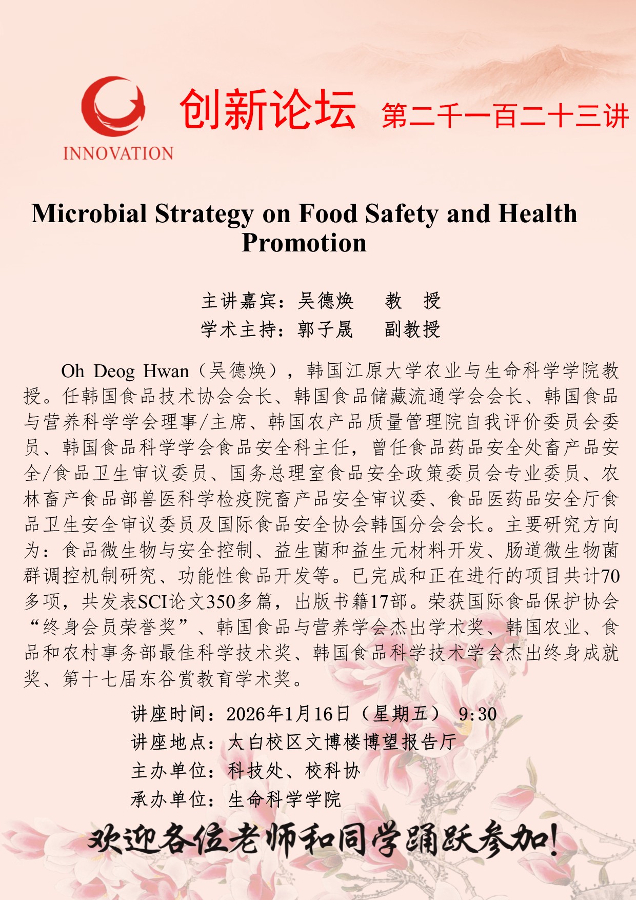 吴德焕 教授 开云网页版登录入口创新论坛第二千一百二十三讲:Microbial Strategy on Food Safety and Health Promotion 讲座时间 2026年1月16日(星期五)9:30 讲座地点 太白校区文博楼博望报告厅 讲座人介绍 吴德焕 教授 讲座内容