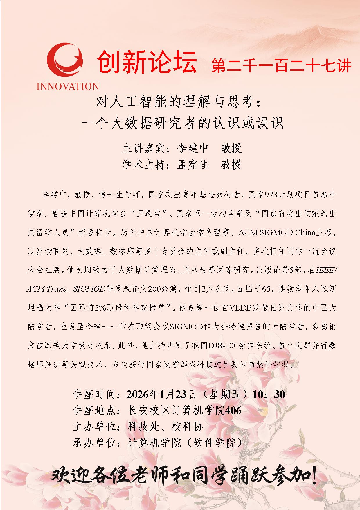 李建中 教授 开云网页版登录入口创新论坛第二千一百二十七讲:对人工智能的理解与思考:一个大数据研究者的认识或误识 讲座时间 2026年1月23日(星期五)10:30 讲座地点 长安校区计算机学院406 讲座人介绍 李建中 教授 讲座内容