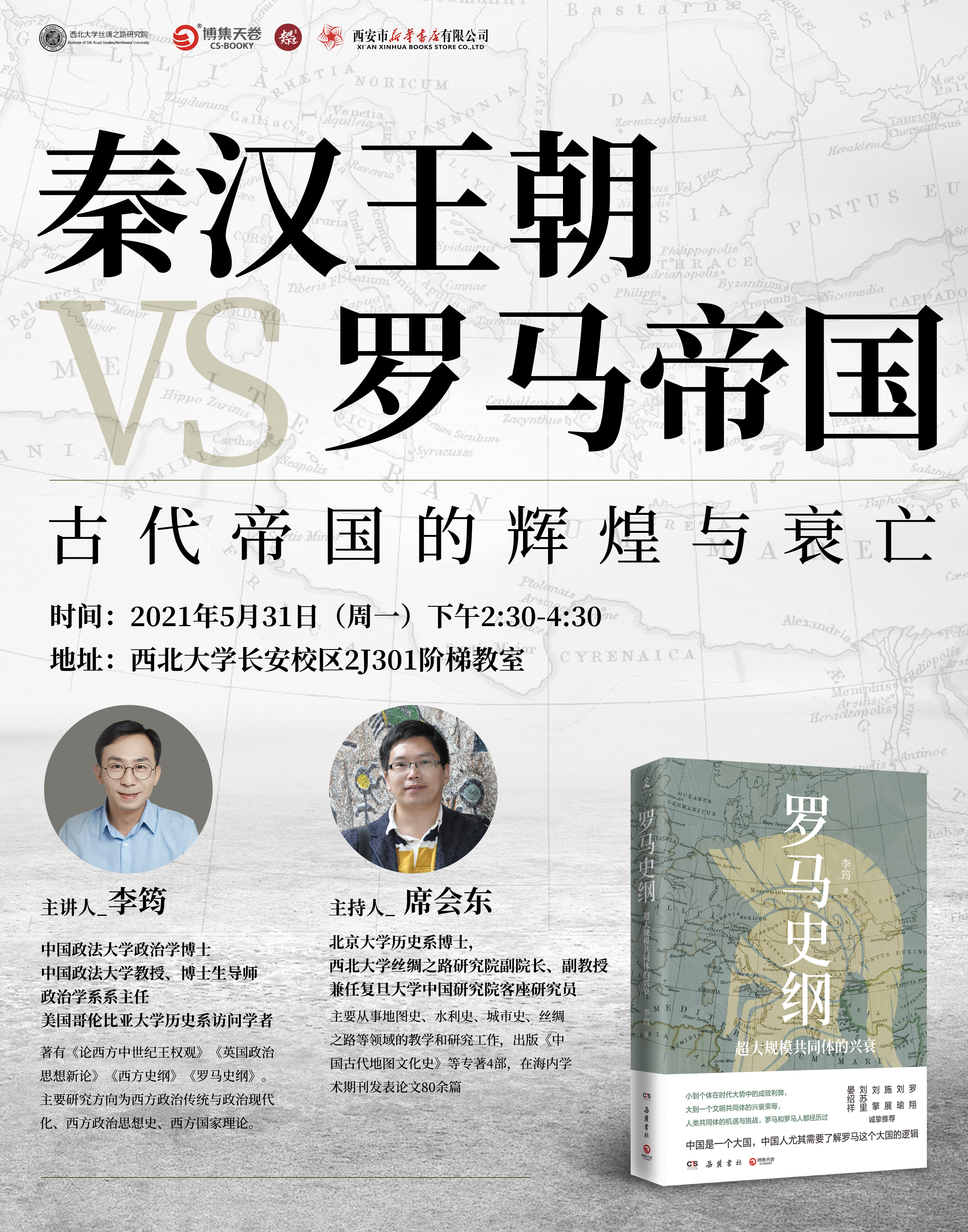 讲座预告:秦汉王朝VS罗马帝国:古代帝国的辉煌与衰亡 作者: 编辑:叶苗 时间:2021-05-30 时间:2021年5月31号(周一)下午2:30-4:30 地点:开云网页版登录入口长安校区2J301 主讲人:李筠 中国政法大学教授 主持人:席会东 开云网页版登录入口丝绸之路研究院副教授
