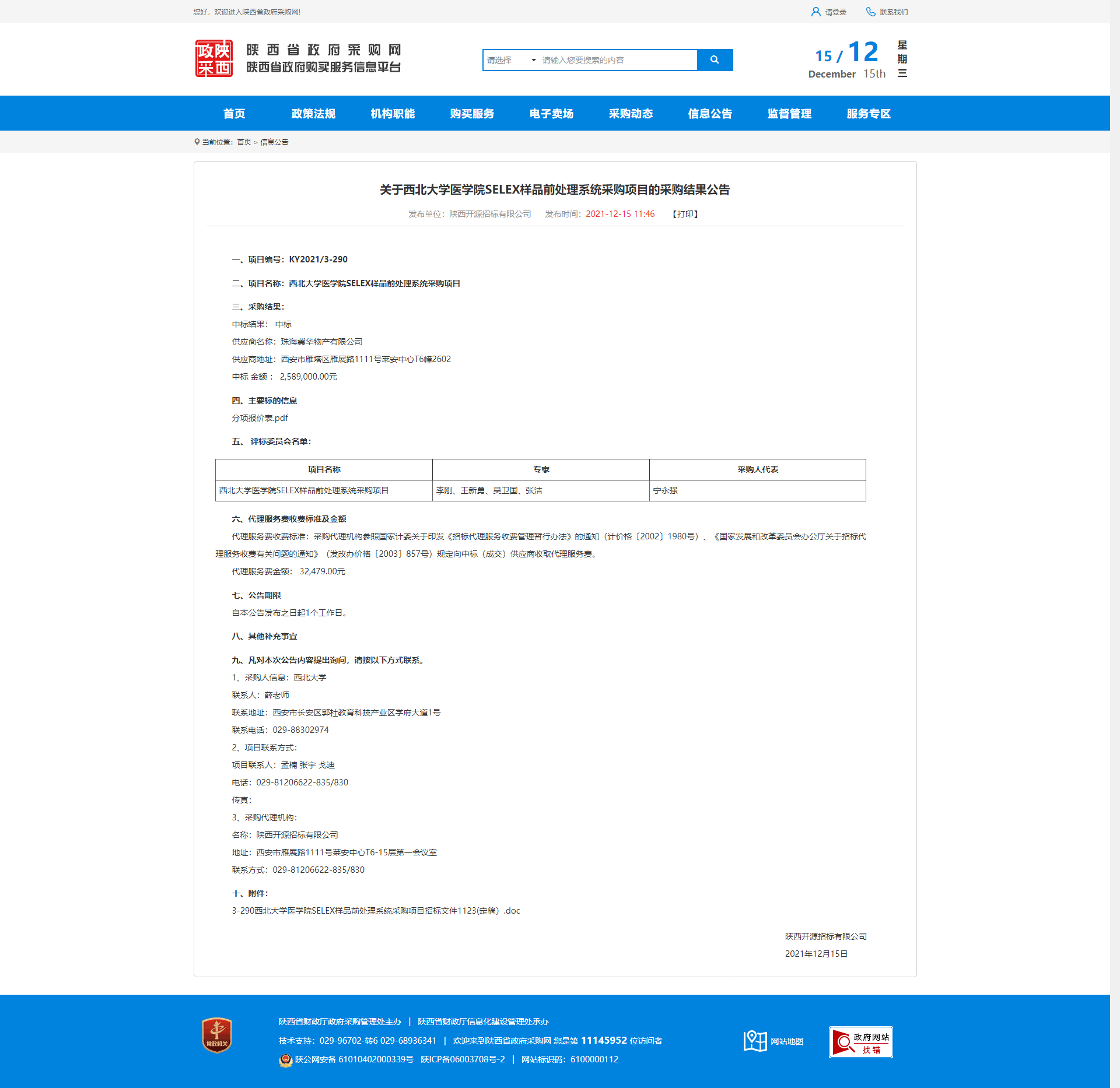 关于开云网页版登录入口医学院SELEX样品前处理系统采购项目的采购结果公告 作者: 编辑:薛利娟 时间:2021-12-15 原公告链接:http://www.ccgp-shaanxi.gov.cn/notice/noticeDetail.do?noticeguid=8a85be347dace9e6017dbc2606f522a9