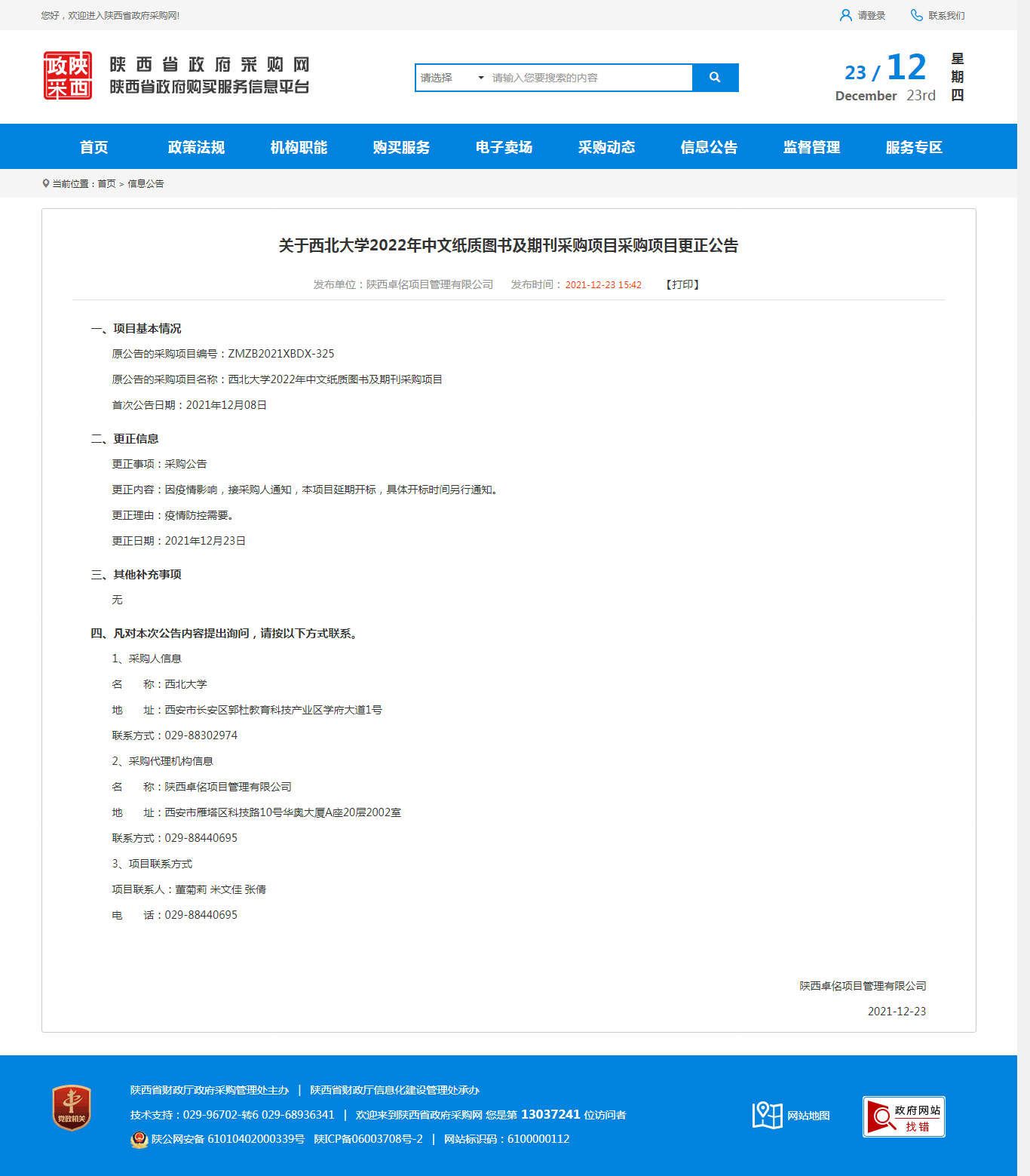 关于开云网页版登录入口2022年中文纸质图书及期刊采购项目采购项目更正公告 作者: 编辑:薛利娟 时间:2021-12-23 原公告链接:http://www.ccgp-shaanxi.gov.cn/notice/noticeDetail.do?noticeguid=8a85be327dace5d8017de63c777e2f27