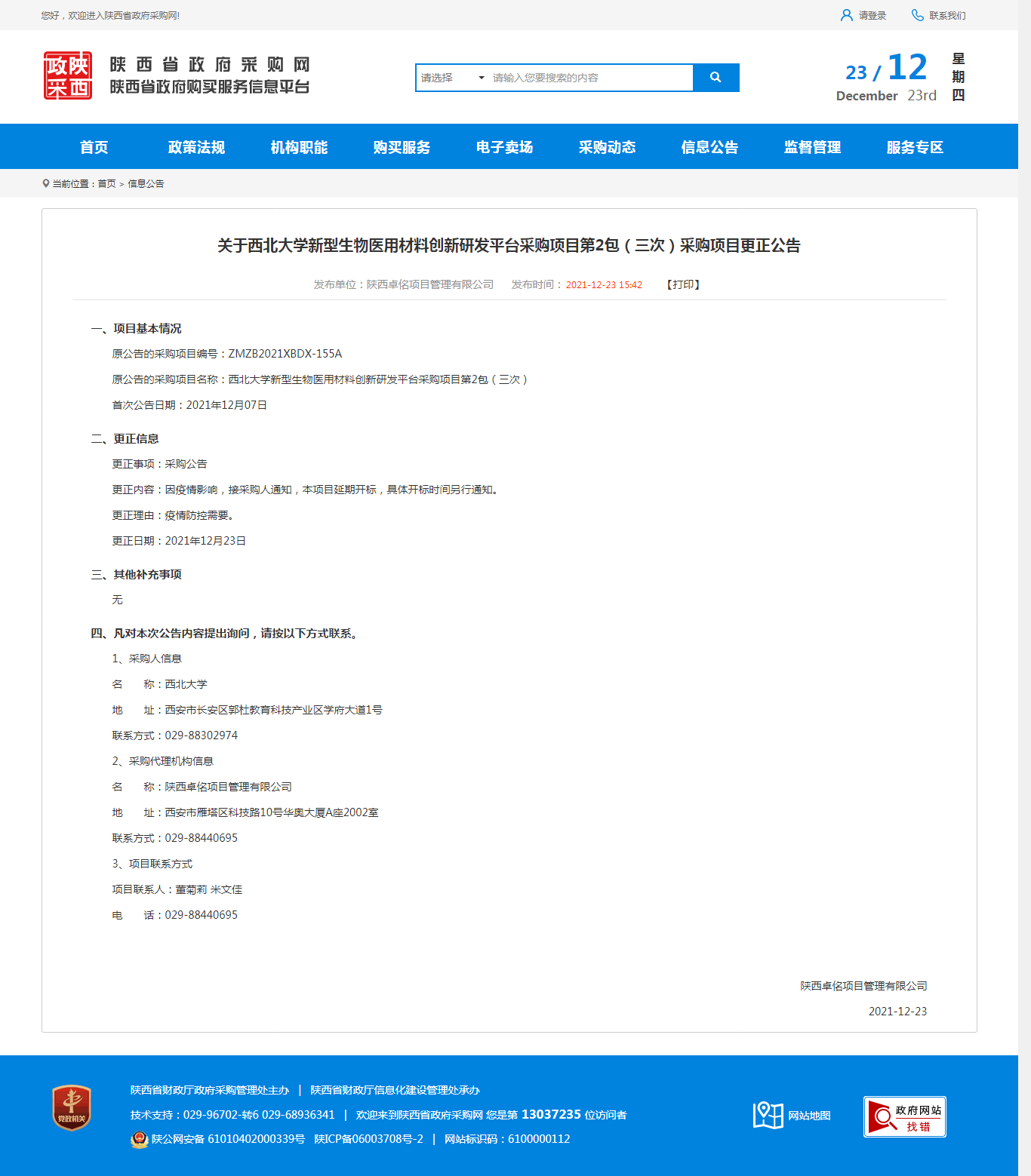 关于开云网页版登录入口新型生物医用材料创新研发平台采购项目第2包(三次)采购项目更正公告 作者: 编辑:薛利娟 时间:2021-12-23 原公告链接:http://www.ccgp-shaanxi.gov.cn/notice/noticeDetail.do?noticeguid=8a85be327dace5d8017de63b467e2efd