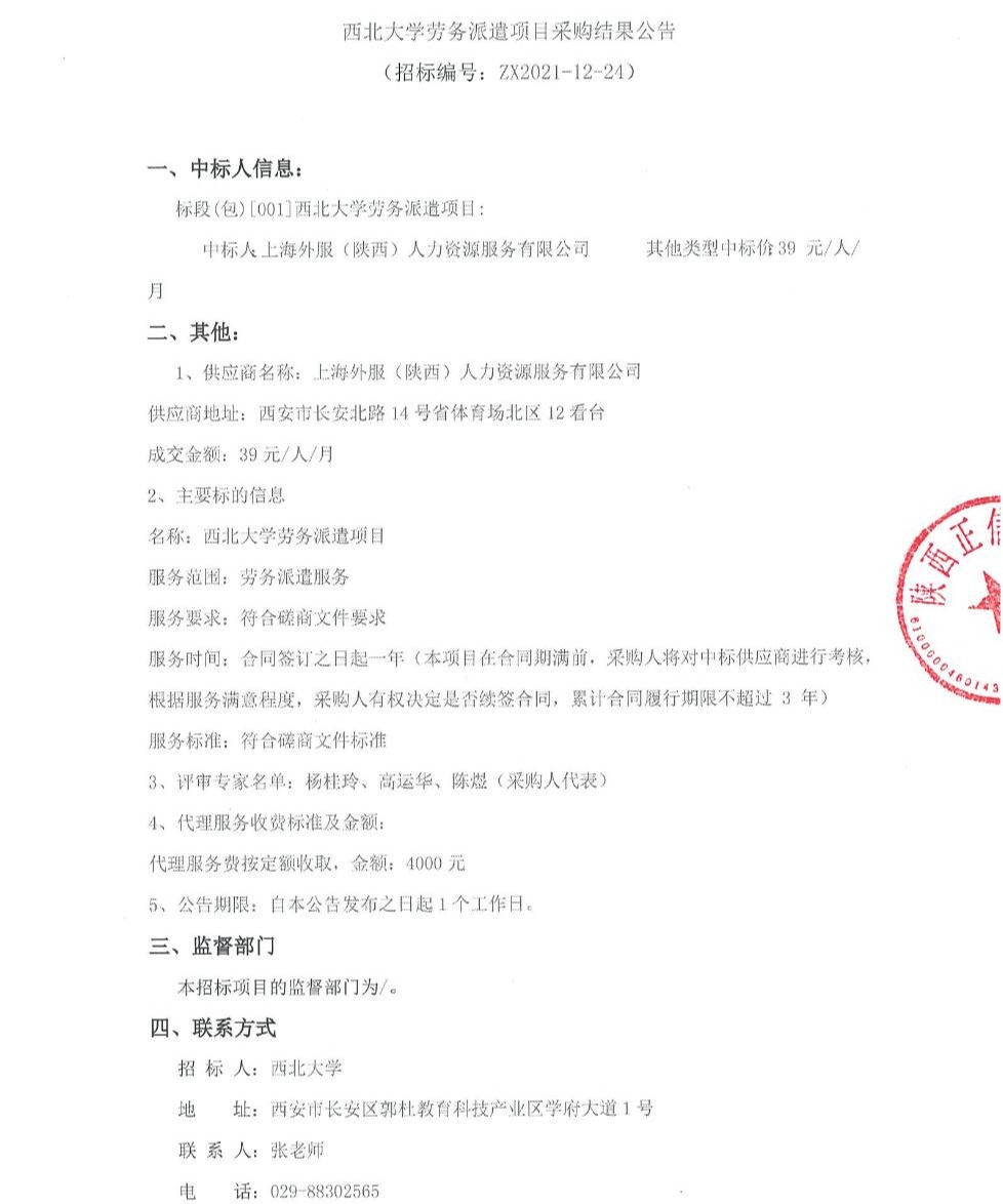 关于开云网页版登录入口劳务派遣项目采购结果公告