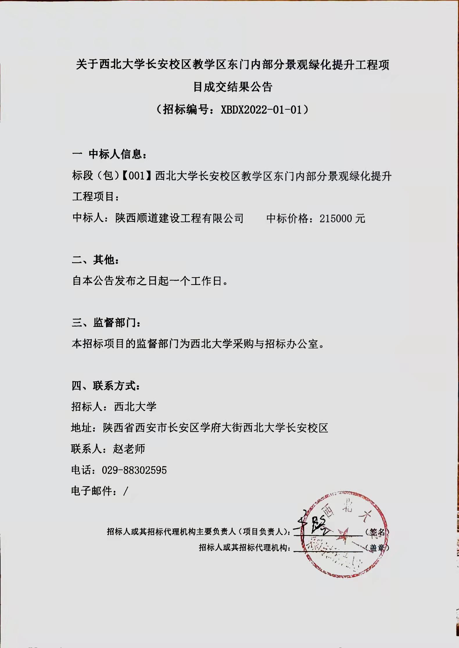 关于开云网页版登录入口长安校区教学区东门内部分景观绿化提升工程项目成交结果公告