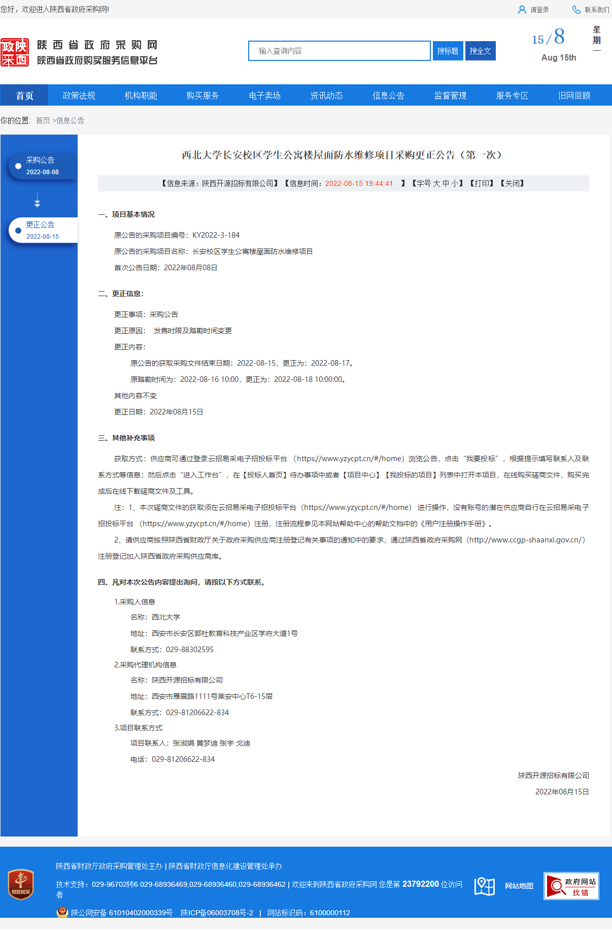 开云网页版登录入口长安校区学生公寓楼屋面防水维修项目采购更正公告(第一次)