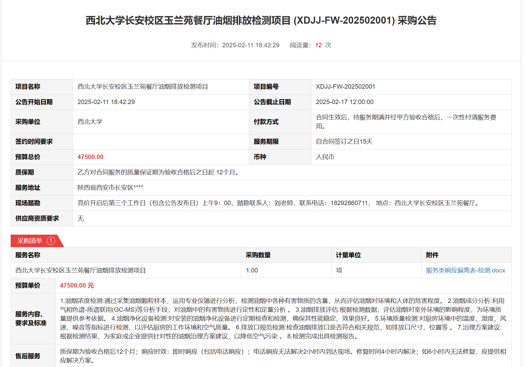开云网页版登录入口长安校区玉兰苑餐厅油烟排放检测项目(XDJJ-FW-202502001)竞价采购公告 作者:采购与招标办公室 编辑: 时间:2025-02-11 原公告链接:https://www.ejingcai.com.cn/site/bidding/detail/16498