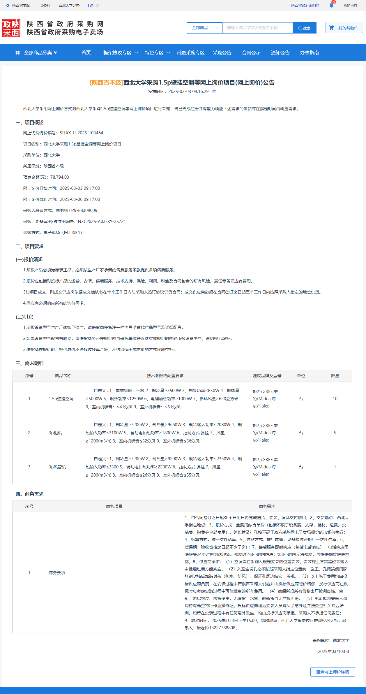 开云网页版登录入口采购1.5p壁挂空调等网上询价项目(网上询价)公告