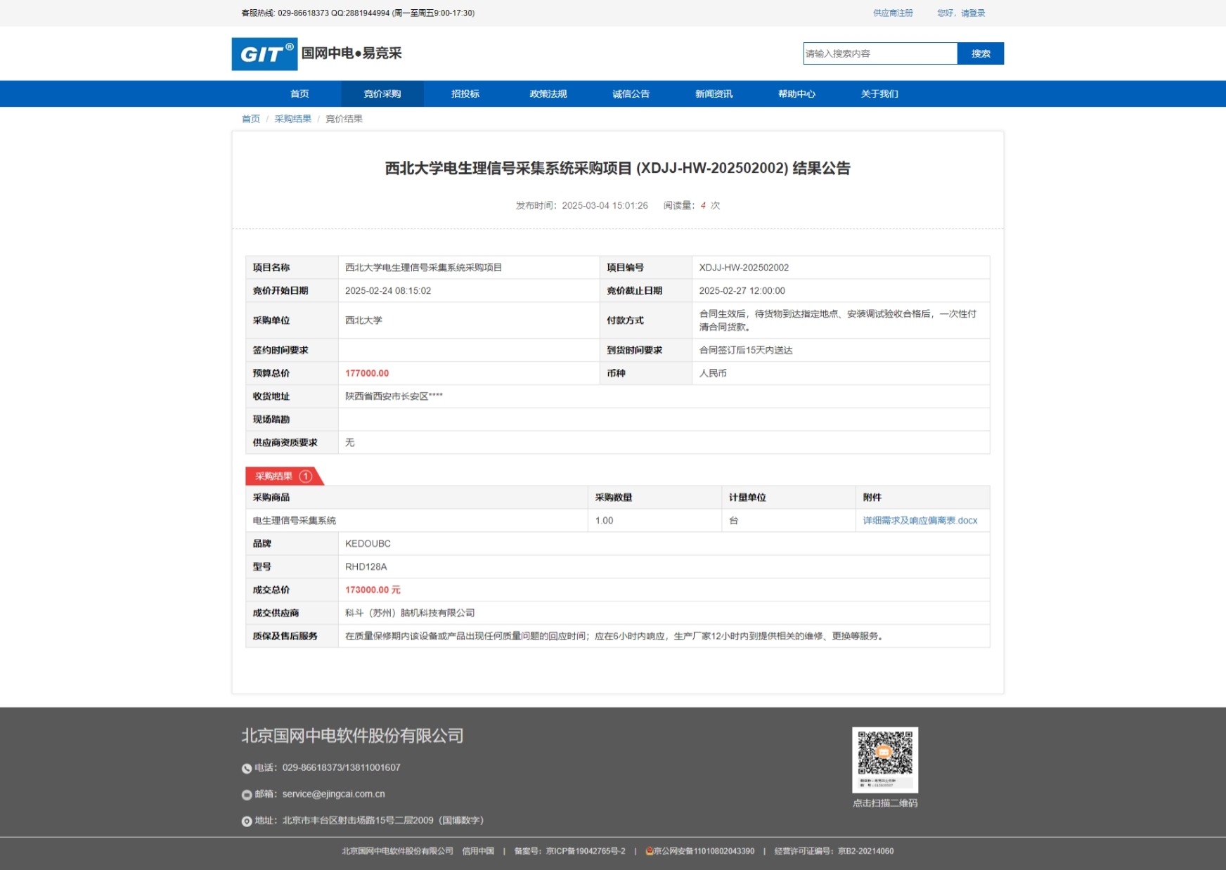 开云网页版登录入口电生理信号采集系统采购项目 (XDJJ-HW-202502002) 竞价结果公告 作者: 编辑:采购与招标办公室 时间:2025-03-04 原公告链接:https://www.ejingcai.com.cn/site/bidding/detail/16713