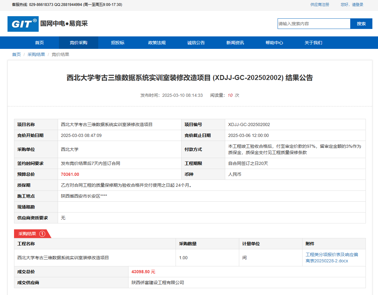 开云网页版登录入口考古三维数据系统实训室装修改造项目(XDJJ-GC-202502002)竞价结果公告 作者:采购与招标办公室 编辑: 时间:2025-03-10 原公告链接:https://www.ejingcai.com.cn/site/bidding/detail/16795