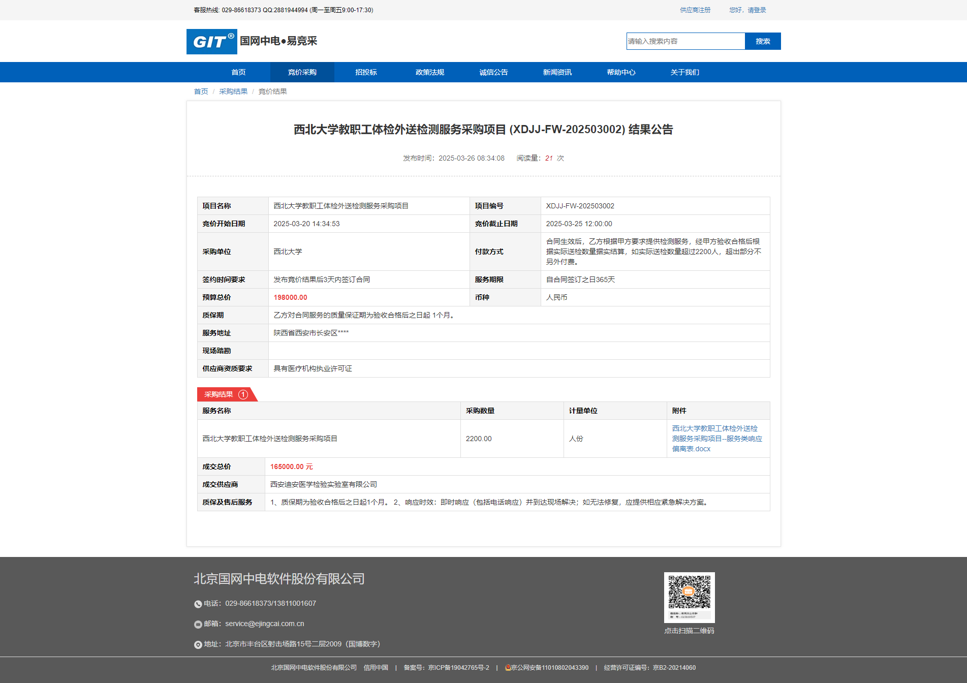 开云网页版登录入口教职工体检外送检测服务采购项目 (XDJJ-FW-202503002) 结果公告