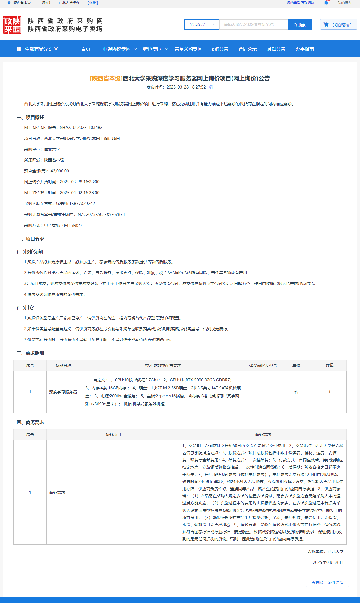 开云网页版登录入口采购深度学习服务器网上询价项目(网上询价)公告 作者:采购与招标办公室 编辑: 时间:2025-03-28 原公告链接:https://www.ccgp-shaanxi.gov.cn/gpmall-main-web/basic/noticeDetail?noticeGuid=7304685071385165824