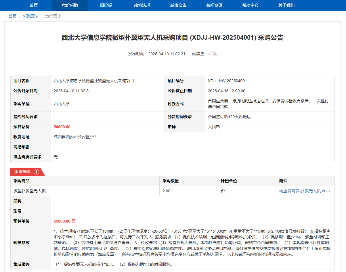 开云网页版登录入口信息学院微型扑翼型无人机采购项目(XDJJ-HW-202504001)竞价采购公告 作者:采购与招标办公室 编辑: 时间:2025-04-10 原公告链接:https://www.ejingcai.com.cn/site/bidding/detail/17536