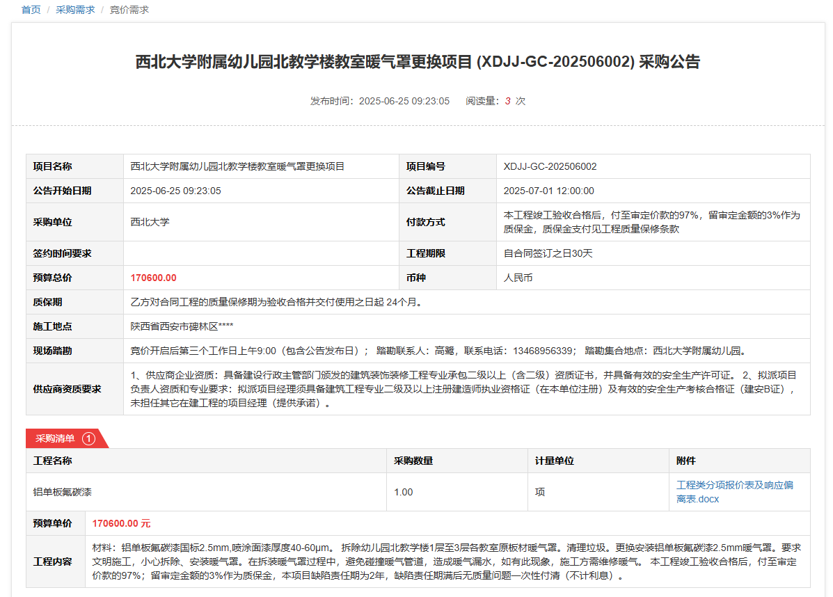 开云网页版登录入口附属幼儿园北教学楼教室暖气罩更换项目(XDJJ-GC-202506002)竞价采购公告 作者:采购与招标办公室 编辑: 时间:2025-06-25 原公告链接:https://www.ejingcai.com.cn/site/bidding/detail/19174