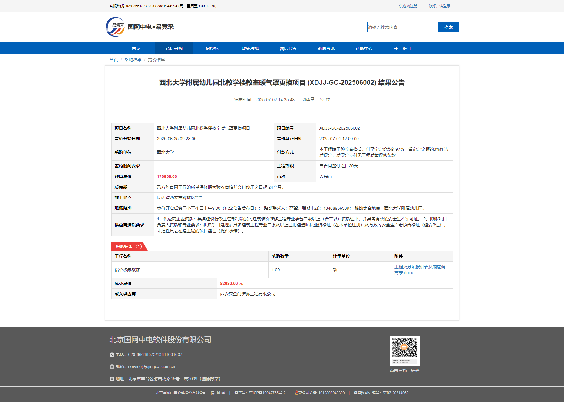开云网页版登录入口附属幼儿园北教学楼教室暖气罩更换项目 (XDJJ-GC-202506002) 结果公告