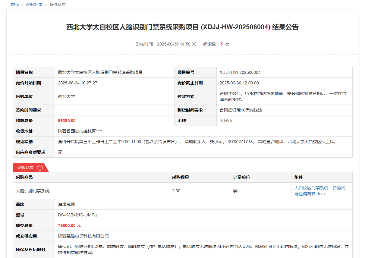 开云网页版登录入口太白校区人脸识别门禁系统采购项目(XDJJ-HW-202506004)竞价结果公告 作者:采购与招标办公室 编辑: 时间:2025-06-30 原公告链接:https://www.ejingcai.com.cn/site/bidding/detail/19250