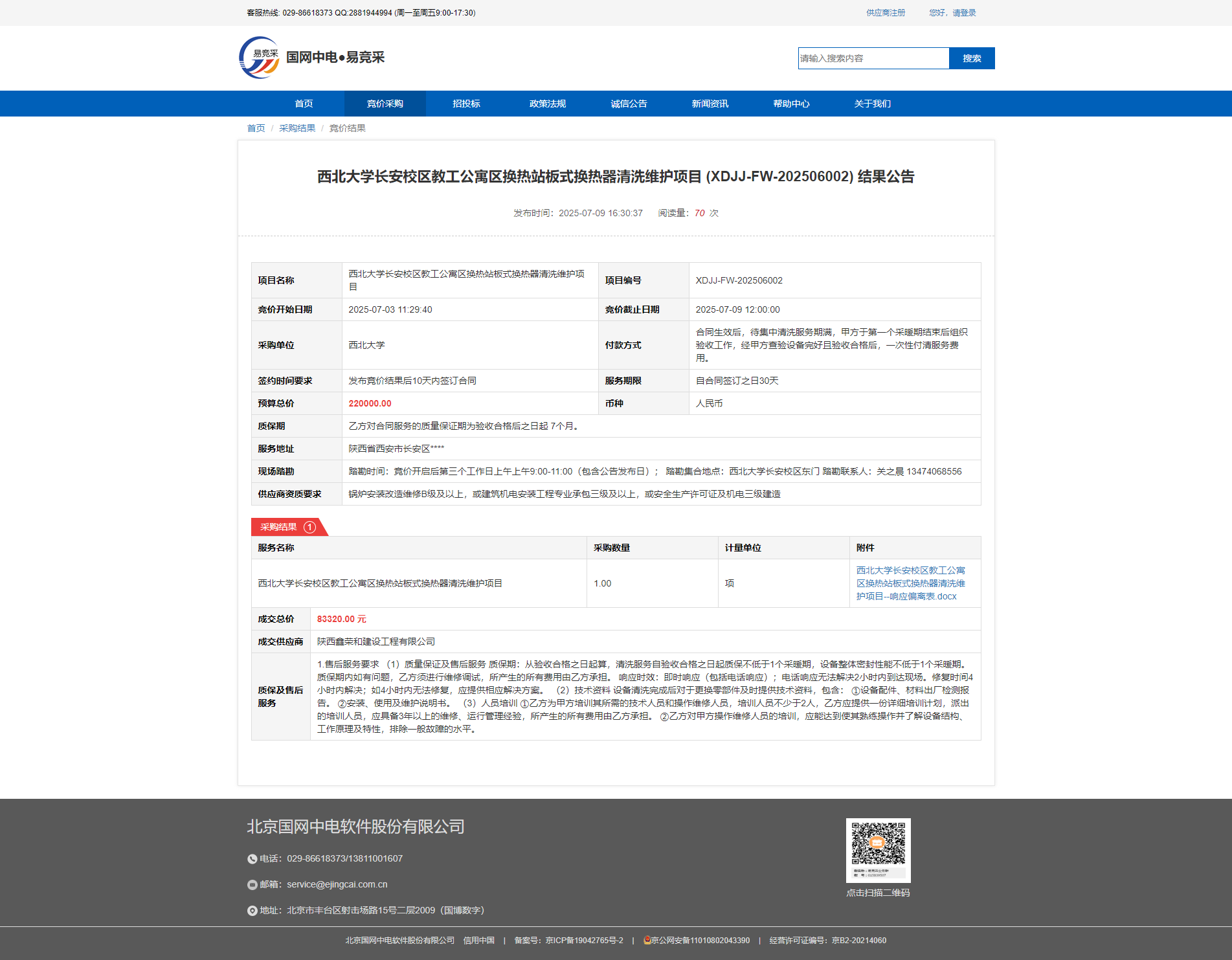 开云网页版登录入口长安校区教工公寓区换热站板式换热器清洗维护项目 (XDJJ-FW-202506002) 结果公告