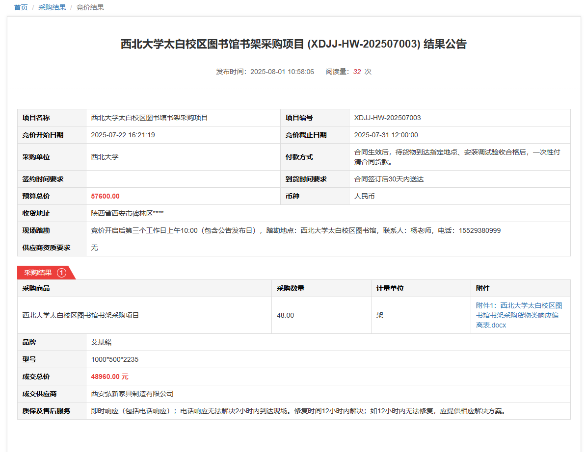开云网页版登录入口太白校区图书馆书架采购项目(XDJJ-HW-202507003)竞价结果公告