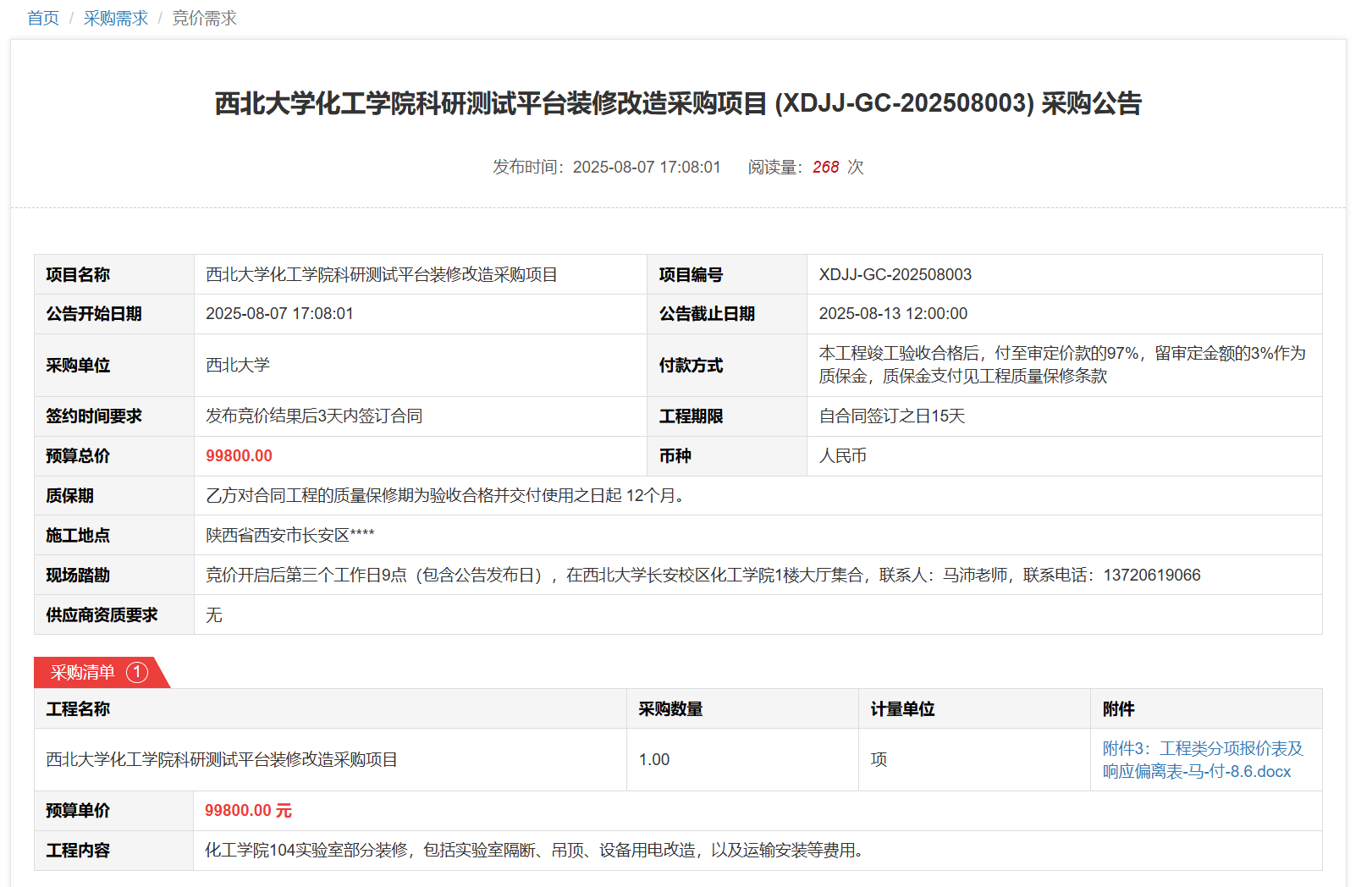 开云网页版登录入口化工学院科研测试平台装修改造采购项目(XDJJ-GC-202508003)竞价采购公告