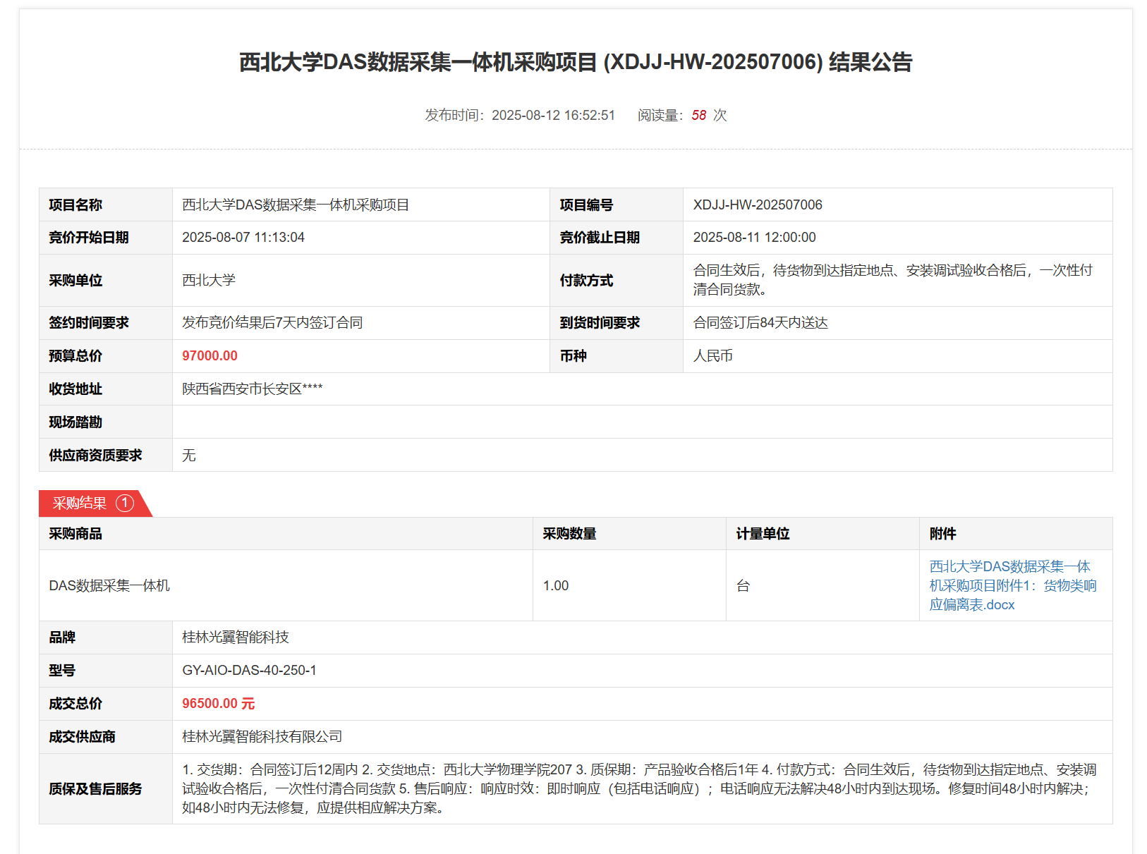 开云网页版登录入口DAS数据采集一体机采购项目(XDJJ-HW-202507006)竞价结果公告