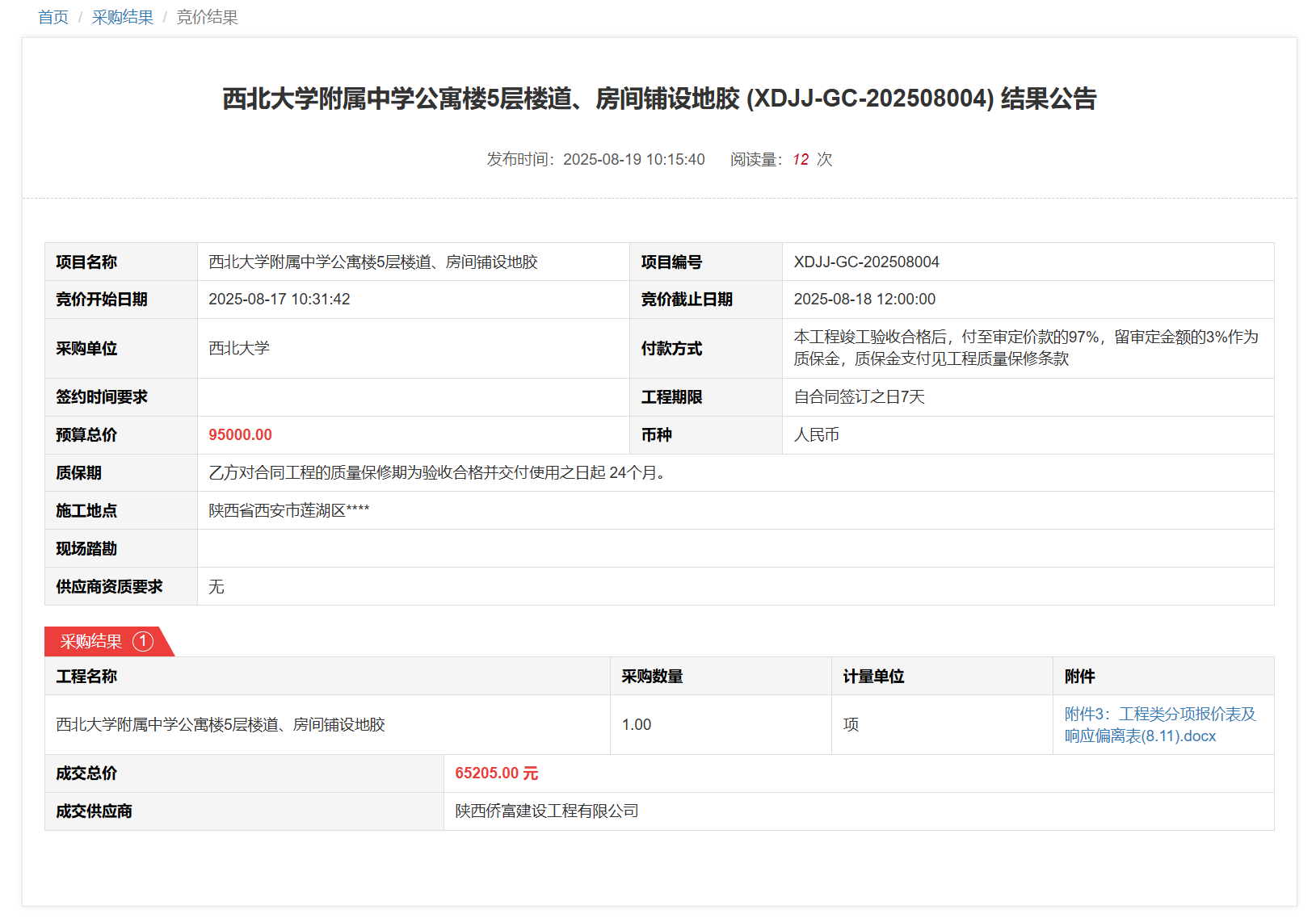 开云网页版登录入口附属中学公寓楼5层楼道、房间铺设地胶(XDJJ-GC-202508004)竞价结果公告