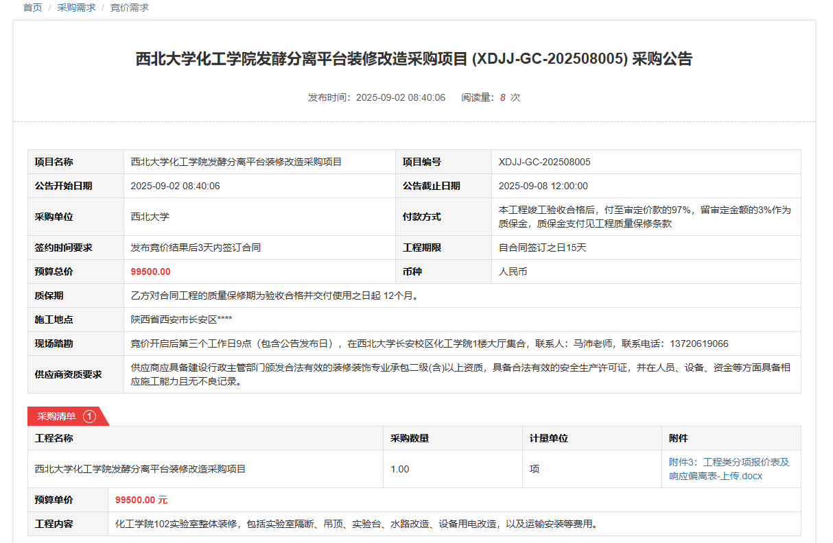 开云网页版登录入口化工学院发酵分离平台装修改造采购项目(XDJJ-GC-202508005)竞价采购公告