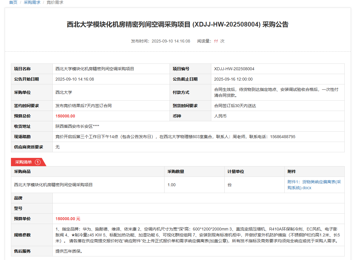 开云网页版登录入口模块化机房精密列间空调采购项目(XDJJ-HW-202508004)竞价采购公告