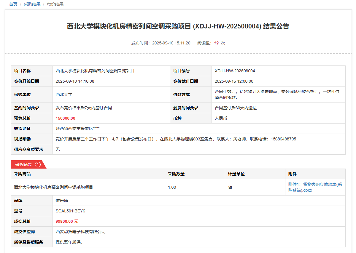 开云网页版登录入口模块化机房精密列间空调采购项目(XDJJ-HW-202508004)竞价结果公告