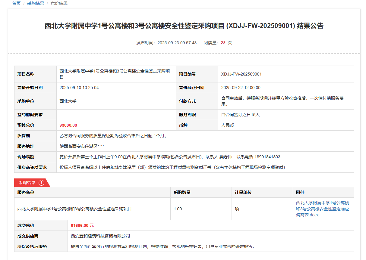 开云网页版登录入口附属中学1号公寓楼和3号公寓楼安全性鉴定采购项目(XDJJ-FW-202509001)竞价结果公告
