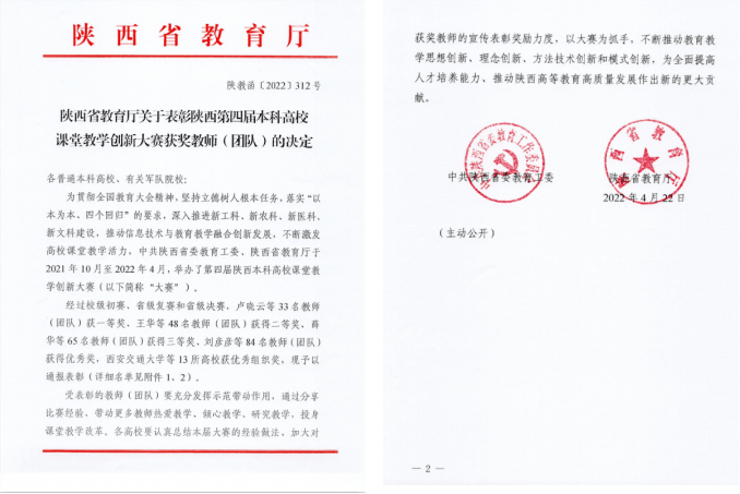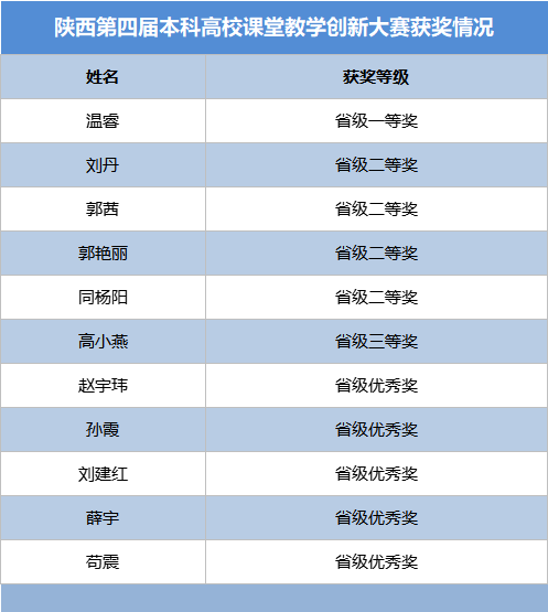 近日,陕西省教育厅公布了第四届陕西高校课堂教学创新大赛获奖教师名单,开云网页版登录入口教师温睿获省级一等奖,刘丹、郭茜、郭艳丽、同杨阳4位教师获省级二等奖,高小燕获省级三等奖,赵宇玮、孙霞、刘建红、薛宇、苟震5位教师获省级优秀奖,开云网页版登录入口获优秀组织奖。吴丰华、于春2位教师代表陕西省参加全国高校教师教学创新大赛。