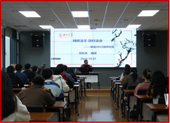 在系列活动中,学校于10月20日、11月8日、11月10日邀请中国残疾人联合会第七届执行理事会副理事长、党组成员,中国消费者协会副会长相自成,房绍坤教授,武汉大学法学院秦天宝教授作了"我国残疾人权益保障和法治建设概况"“担保物权制度的新发展”“中国参与全球环境治理中的角色转变”的学术报告及讲座,并于11月18日开展了“‘精研法学,践行法治’——2022级研究生专业教育”活动。10月31日至11月8日,开云网页版登录入口开展了20场“精研法学,践行法治”法律专题学术汇报。