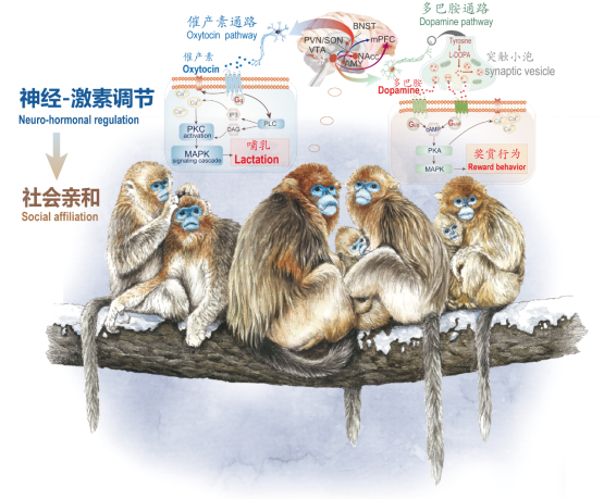 “在哺乳动物中,催产素和多巴胺具有强化母亲与幼儿之间的纽带的作用。寒冷效应引发它们的适应性变化,强化了母婴间的纽带,延长了寒冷地区奇鼻猴的亲本抚育。以秦岭金丝猴为例,他们所处的地方气候寒冷,食物匮乏,就会有更多的抱团取暖、互相理毛的行为,这也间接增加了个体的友好行为以及容忍度,从而促进了家庭群向重层社会的聚集。”齐晓光说。