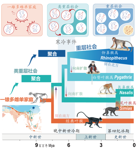 同时,团队将研究目光拉长至800万年前,从生物化石所提示的历史分布和对古海平面、古地理、古气候等大数据的挖掘,一点点拼凑出亚洲叶猴祖先的扩散路径。团队发现,生活在寒冷环境中的物种倾向于形成较大的社群,且两次社会聚合分别发生在晚中新世冷期和更新世第四纪冰期,表明寒冷事件可能驱动了社群聚集。以此为依据,团队提出了亚洲叶猴“三幕式”的社会演化历史,该发现也是对团队早先提出的“亚洲起源-聚合”假说的系统阐明。
