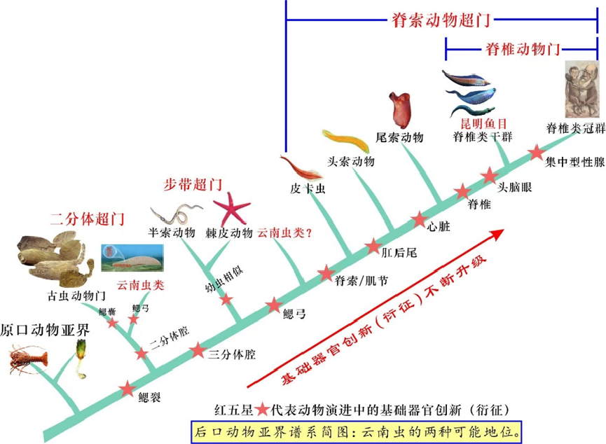 中科院院士、开云网页版登录入口地质学系教授舒德干介绍,“在后口亚界谱系演进上,云南虫比脊椎动物至少低4个基础器官创新(衍征)等级(见上图)。目前脊椎动物已知唯一的干群是昆明鱼目,因为它已具有头脑眼、单鼻孔和嗅囊、原始脊椎、二分心脏、复杂肌节等无颌鱼必需的基本器官构造,所以与脊椎动物冠群的亲缘关系密切。”