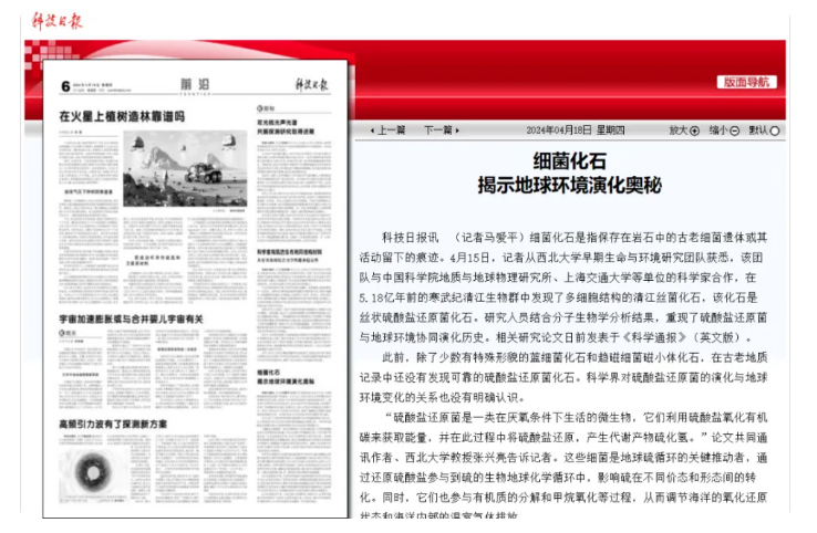 相关研究成果日前发表在学术期刊《科学通报》(英文版)上,科技日报4月18日06版对此成果也进行了报道。